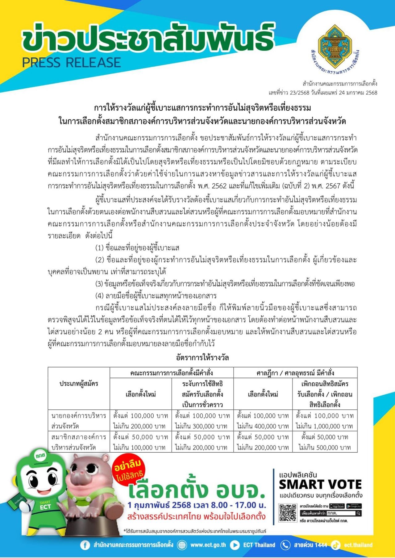 ล่าสุด สำนักงานคณะกรรมการการเลือกตั้ง ยังได้ประชาสัมพันธ์การให้รางวัลแก่ผู้ชี้เบาะแสการกระทำการอันไม่สุจริตหรือเที่ยงธรรมในการเลือกตั้ง ส.อบจ. และนายก อบจ. ที่มีผลทำให้การเลือกตั้งมิได้เป็นไปโดยสุจริตหรือเที่ยงธรรมหรือเป็นไปโดยมิชอบด้วยกฎหมาย ตามระเบียบคณะกรรมการการเลือกตั้งว่าด้วยค่าใช้จ่ายในการแสวงหาข้อมูลข่าวสารและการให้รางวัลแก่ผู้ชี้เบาะแสการกระทำการอันไม่สุจริตหรือเที่ยงธรรมในการเลือกตั้ง พ.ศ. 2562 และที่แก้ไขเพิ่มเติม (ฉบับที่ 2) พ.ศ. 2567 ดังนี้