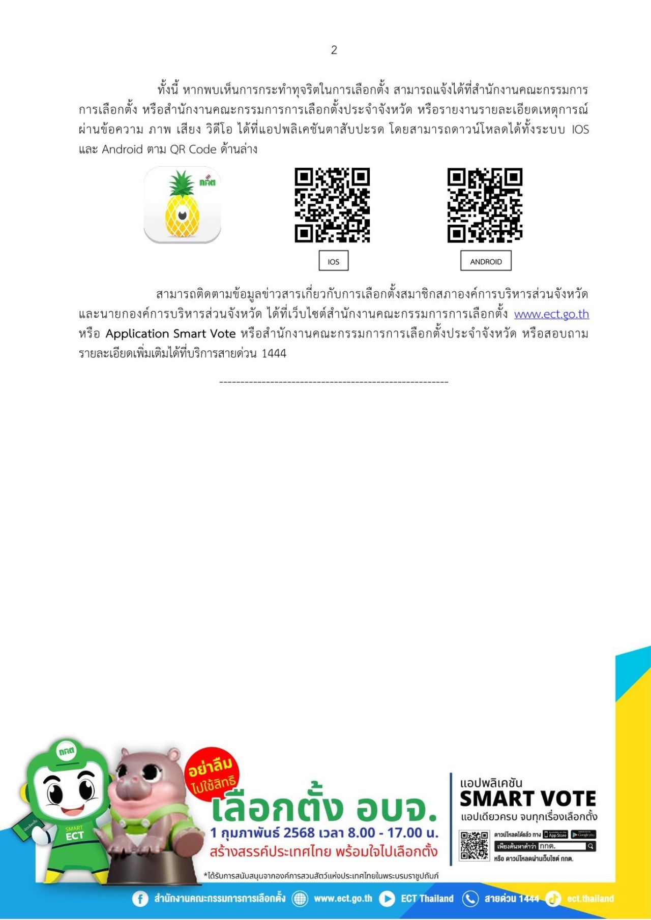 กกต. ย้ำวันเสาร์ที่ 1 ก.พ. เลือกตั้ง อบจ. 2568 ย้ำ นายก อบจ. 47 จังหวัด ส่วน ส.อบจ.ทั่วประเทศ พร้อมเผยอัตราเงินรางวัลชี้เบาะแสทุจริต 5 หมื่นถึงหลักล้าน หากนำไปสู่เลือกตั้งใหม่-สั่งเพิกถอนสิทธิ