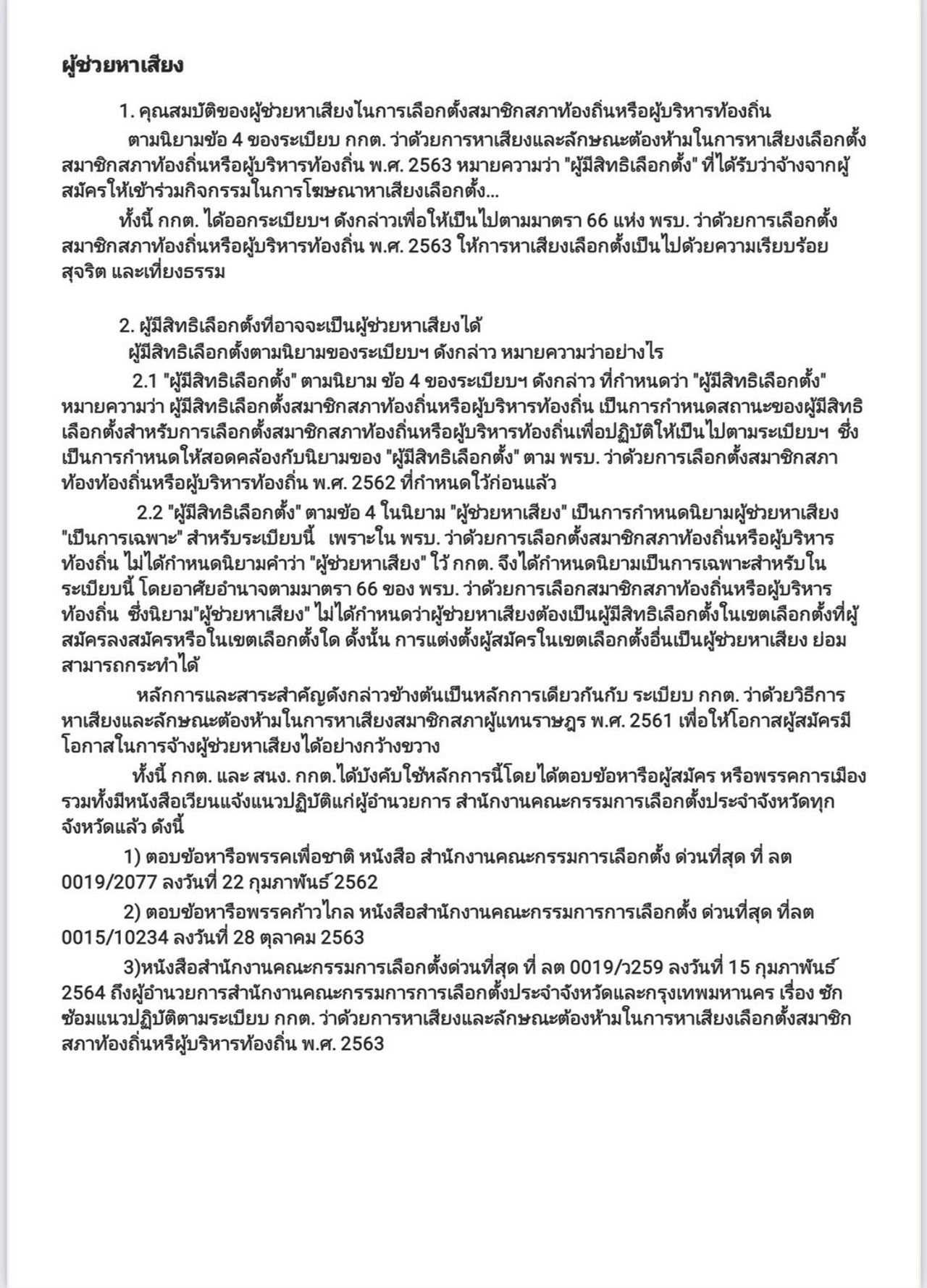 นอกจากนี้ ยังแนบรายละเอียดข้อกฎหมาย คำนิยาม และระบุว่า กกต. และสำนักงาน กกต. ได้บังคับใช้หลักการนี้โดยตอบข้อหารือผู้สมัคร หรือพรรคการเมือง รวมทั้งมีหนังสือเวียนแจ้งแนวปฏิบัติแก่ผู้อำนวยการ สำนักงานคณะกรรมการการเลือกตั้งประจำจังหวัดทุกจังหวัดมาตั้งแต่ปี 2562 แล้ว และเคยตอบข้อหารือของพรรคก้าวไกลเมื่อปี 2563