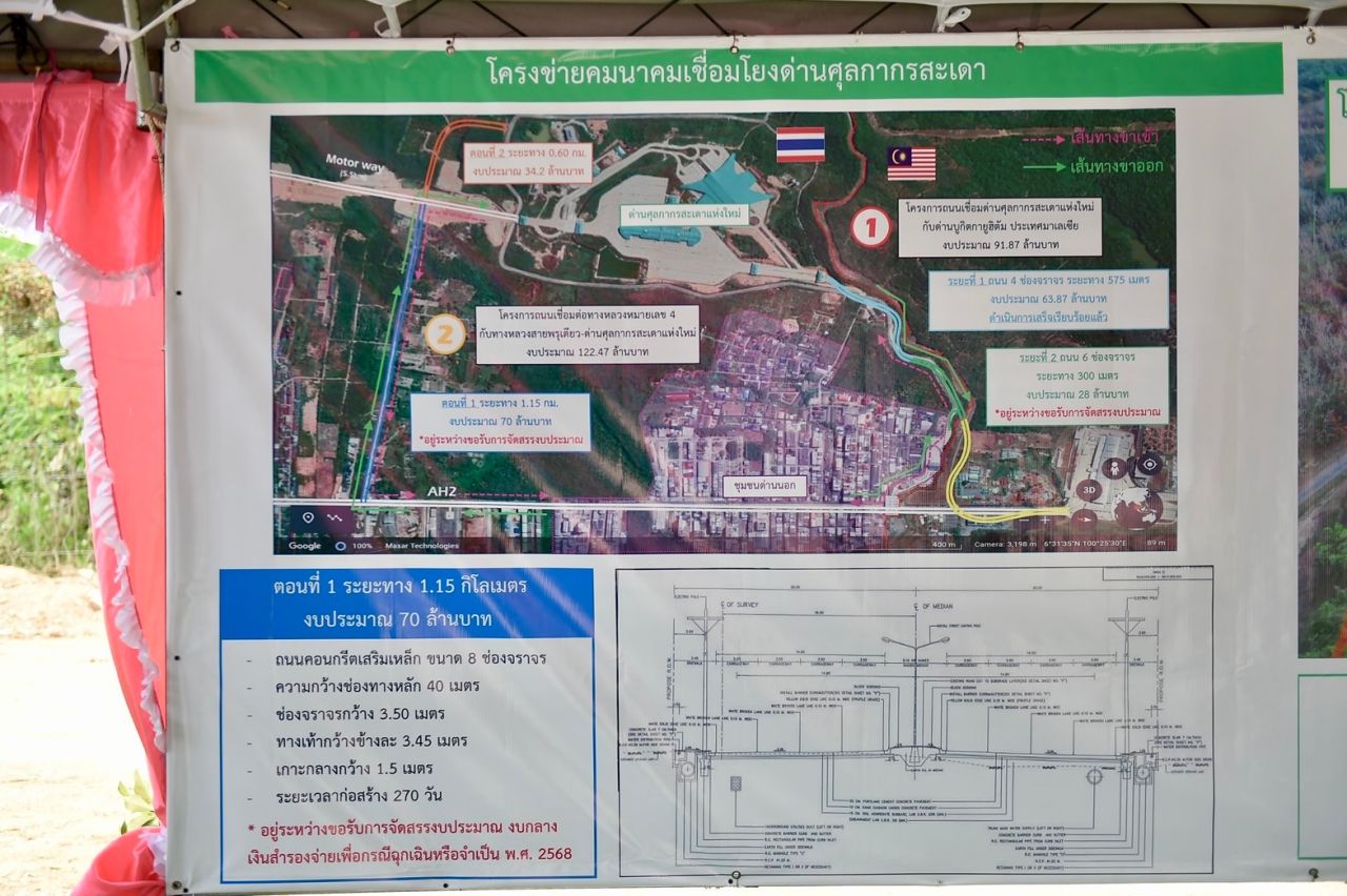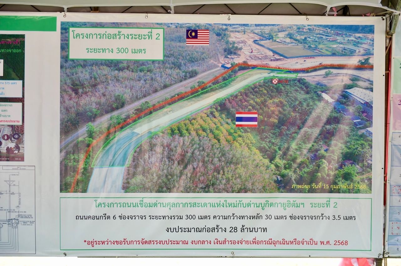 เมื่อเวลา 13.20 น. วันที่ 18 กุมภาพันธ์ 2568 น.ส.แพทองธาร ชินวัตร นายกรัฐมนตรี พร้อมด้วย นายสุริยะ จึงรุ่งเรืองกิจ รองนายกรัฐมนตรีและรัฐมนตรีว่าการกระทรวงคมนาคม นายอนุทิน ชาญวีรกูล รองนายกรัฐมนตรีและรัฐมนตรีว่าการกระทรวงมหาดไทย นายมาริษ เสงี่ยมพงษ์ รัฐมนตรีว่าการกระทรวงการต่างประเทศ นายพิพัฒน์ รัชกิจประการ รัฐมนตรีว่าการกระทรวงแรงงาน น.ส.จิราพร สินธุไพร รัฐมนตรีประจำสำนักนายกรัฐมนตรี นายจุลพันธ์ อมรวิวัฒน์ รัฐมนตรีช่วยว่าการกระทรวงคลัง นางมนพร เจริญศรี รัฐมนตรีช่วยว่าการกระทรวงคมนาคม น.ส.ซาบีดา ไทยเศรษฐ์ รัฐมนตรีช่วยว่าการกระทรวงมหาดไทย น.ส.ธีรรัตน์ สำเร็จวาณิชย์ รัฐมนตรีช่วยว่าการกระทรวงมหาดไทย นายเดชอิศม์ ขาวทอง รัฐมนตรีช่วยว่าการกระทรวงสาธารณสุข ลงพื้นที่ติดตามความคืบหน้าโครงการก่อสร้างถนนคอนกรีต ระยะที่ 2 ระยะทาง 300 เมตร วงเงินงบประมาณ 28 ล้านบาท ที่จุดเชื่อมต่อด่านศุลกากรสะเดาแห่งใหม่ กับด่านบูกิตกายูฮิตัม โดยเจ้าหน้าที่ได้รายงานว่า งบประมาณในโครงการดังกล่าว องค์การบริหารส่วนจังหวัดสงขลา จะเป็นผู้ดำเนินการโดยจะขออนุมัติงบกลาง และมีกำหนดแล้วเสร็จวันที่ 30 ตุลาคม 2568 เพื่อเชื่อมต่อกับทางมาเลเซีย โดย น.ส.แพทองธาร กล่าวว่า ให้นายจุลพันธ์ไปดูเรื่องการของบประมาณ เพื่อให้โครงการแล้วเสร็จตามกำหนด
