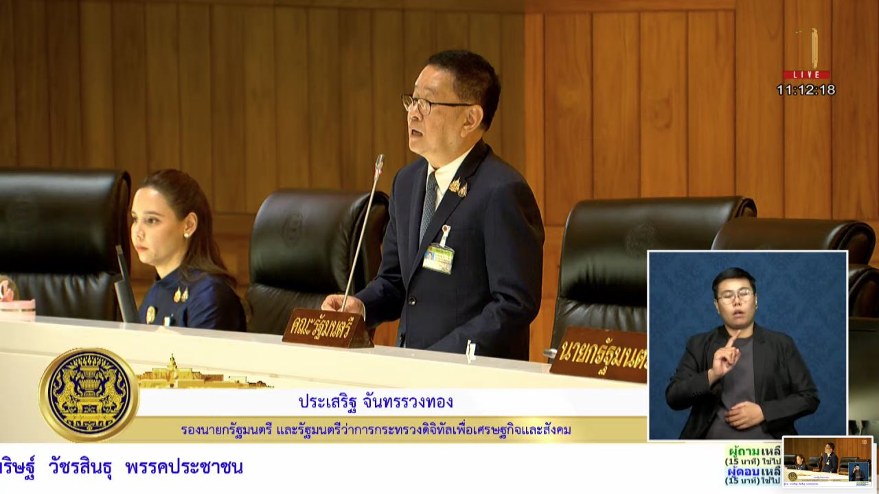 ทางด้าน นายประเสริฐ จันทรรวงทอง รองนายกรัฐมนตรีและรัฐมนตรีว่าการกระทรวงดิจิทัลเพื่อเศรษฐกิจและสังคม ได้รับมอบหมายจากนายกรัฐมนตรีมาตอบกระทู้แทน ว่า ยืนยันเจตนารมณ์รัฐบาลเร่งแก้รัฐธรรมนูญ พรรคร่วมรัฐบาลไม่มีความขัดแย้งเรื่องแก้รัฐธรรมนูญ แต่อาจมีความคิดเห็นแตกต่างกันบ้างในเรื่องกระบวนการ การแสดงความคิดเห็นของสมาชิกรัฐสภาถือเป็นเอกสิทธิ์ แต่ยังมีจุดมุ่งหมายเดียวกันในการแก้รัฐธรรมนูญ ส่วนเรื่องสถานบันเทิงครบวงจรนั้น พรรคการเมืองต่างๆ จะมีการพูดคุยกัน ขณะนี้ร่างกฎหมายดังกล่าวยังไม่เข้าสู่การพิจารณาในสภาผู้แทนราษฎร ทั้งนี้ นายกรัฐมนตรีได้พูดคุยกับหัวหน้าพรรคการเมืองพรรคร่วมรัฐบาลตลอดเวลาเพื่อสร้างความเข้าใจในเรื่องต่างๆ ไม่มีการแลกเปลี่ยนเรื่องอะไรเลย มีเพียงมุ่งเน้นเรื่องที่ประชาชนและประเทศจะได้รับผลประโยชน์สูงสุด เจตจำนงใน 2 นโยบายหลักที่แถลงต่อสภาฯ นั้น นายกรัฐมนตรีใช้ภาวะผู้นำในการคุยกับหัวหน้าพรรคร่วมรัฐบาล ไม่มีเดินอ้อม จะต้องพูดคุยกัน บางเรื่องต้องใช้เวลา แต่ยืนยันรัฐบาลให้ความสำคัญ.