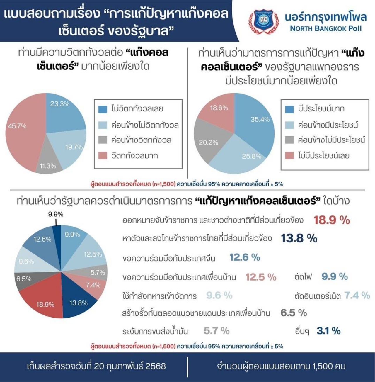 วันที่ 22 ก.พ. 2568 นายสานิต ศิริวิศิษฐ์กุล หัวหน้าศูนย์สำรวจความคิดเห็น นอร์ทกรุงเทพโพล เปิดเผยว่า “นอร์ทกรุงเทพโพล” มหาวิทยาลัยนอร์ทกรุงเทพ ได้สำรวจความเห็นประชาชนถึงการแก้ปัญหาแก๊งคอลเซ็นเตอร์ของรัฐบาล มีผู้สำรวจ 1,500 ราย จากทั่วทุกภูมิภาค ภาพรวมมองว่ารัฐบาลไทยแก้ปัญหาคอลเซ็นเตอร์ได้ถูกทาง จากการดำเนินการทุกมาตรการ เช่น การตัดสัญญาณในระบบสื่อสาร ตัดไฟฟ้า ตัดอินเทอร์เน็ต และระงับส่งน้ำมัน รวมถึงการร่วมมือกับประเทศเพื่อนบ้าน ทั้งนี้ในหัวข้อมีความวิตกกังวลต่อแก๊งคอลเซ็นเตอร์มากน้อยเพียงใด พบว่าประชาชนมีความวิตกกังวล 57% แบ่งเป็นวิตกกังวลมาก 45.7% ค่อนข้างวิตกกังวล 11.3% ขณะที่ประชาชนบางส่วน ค่อนข้างไม่วิตกกังวล 19.7% และไม่วิตกกังวลเลย 23.3%
