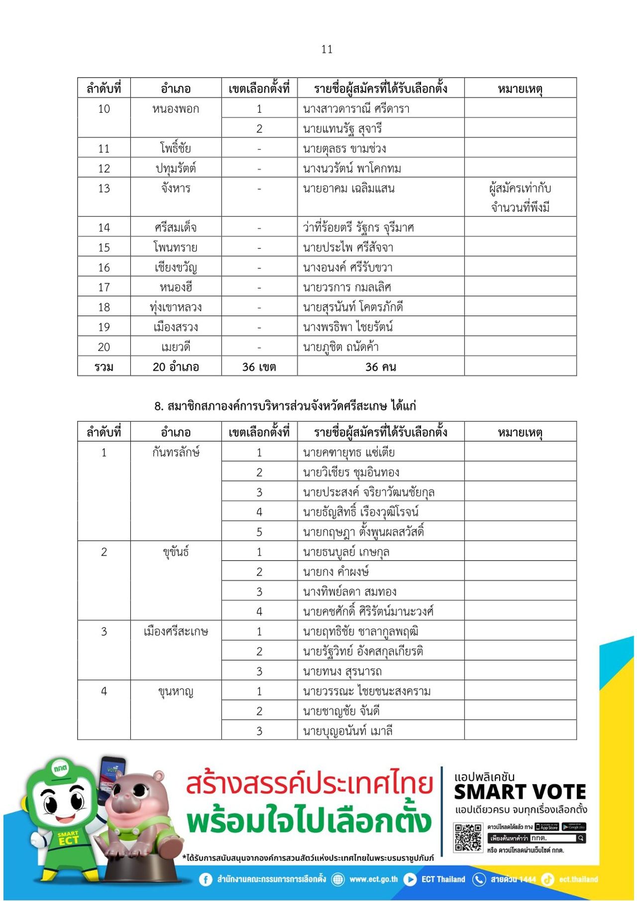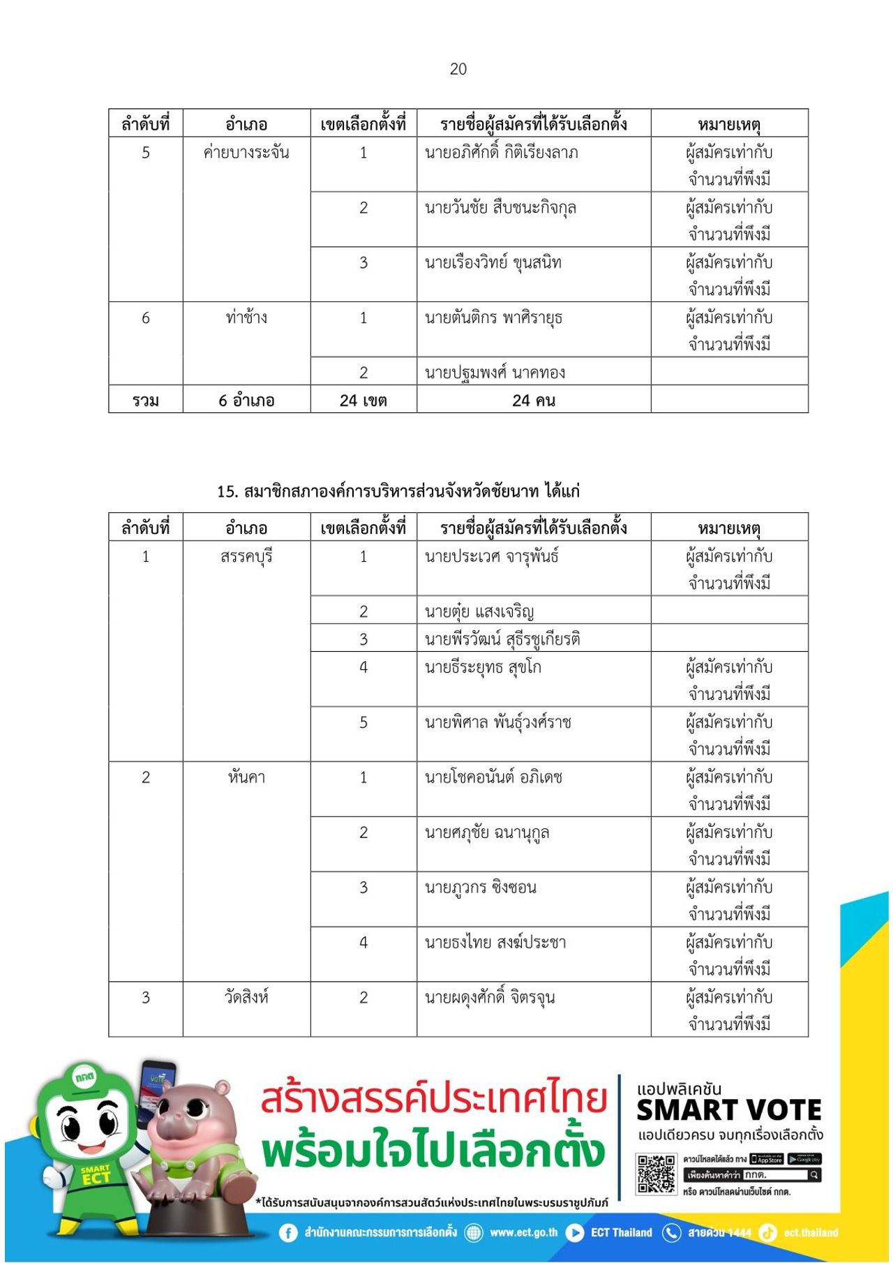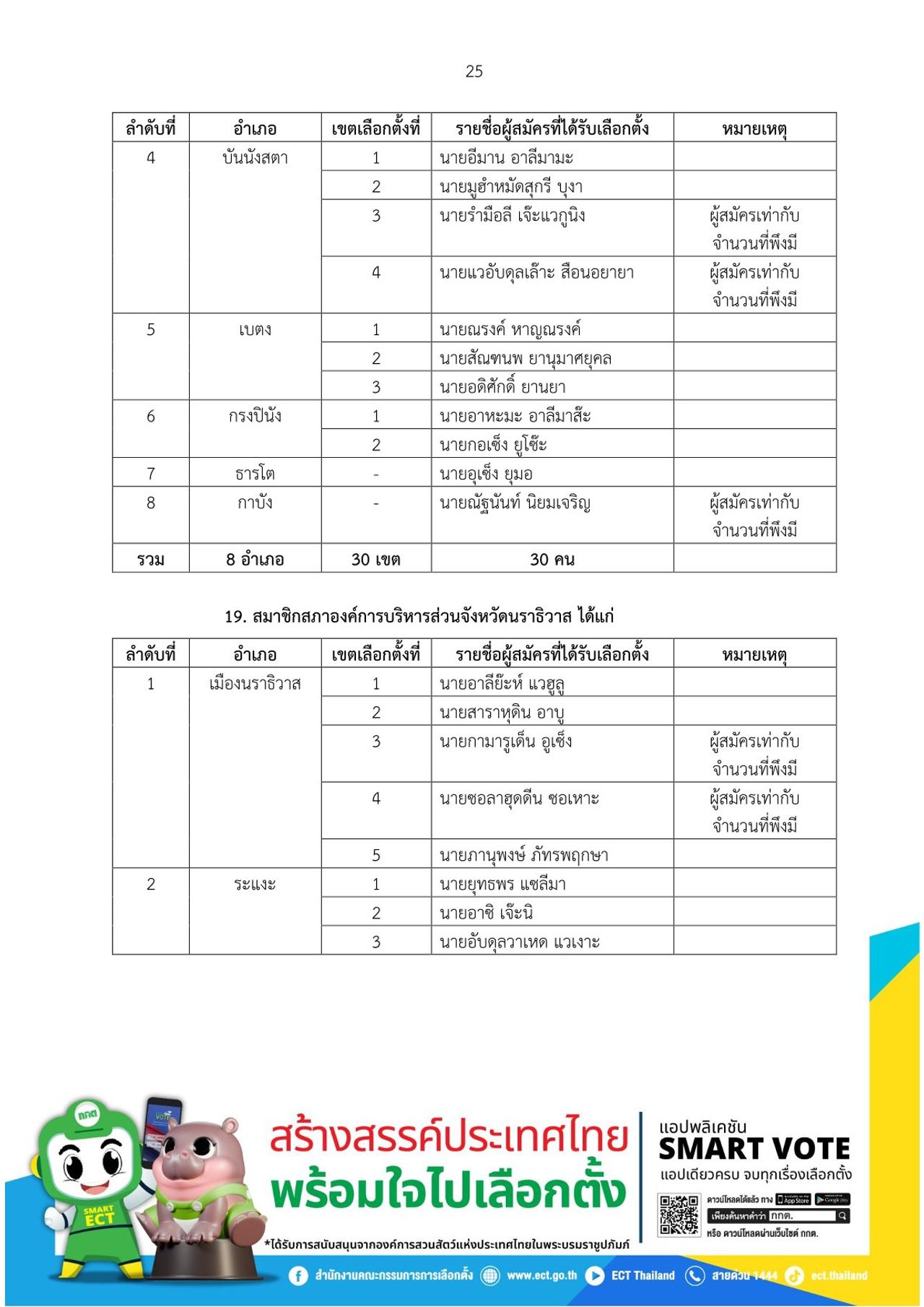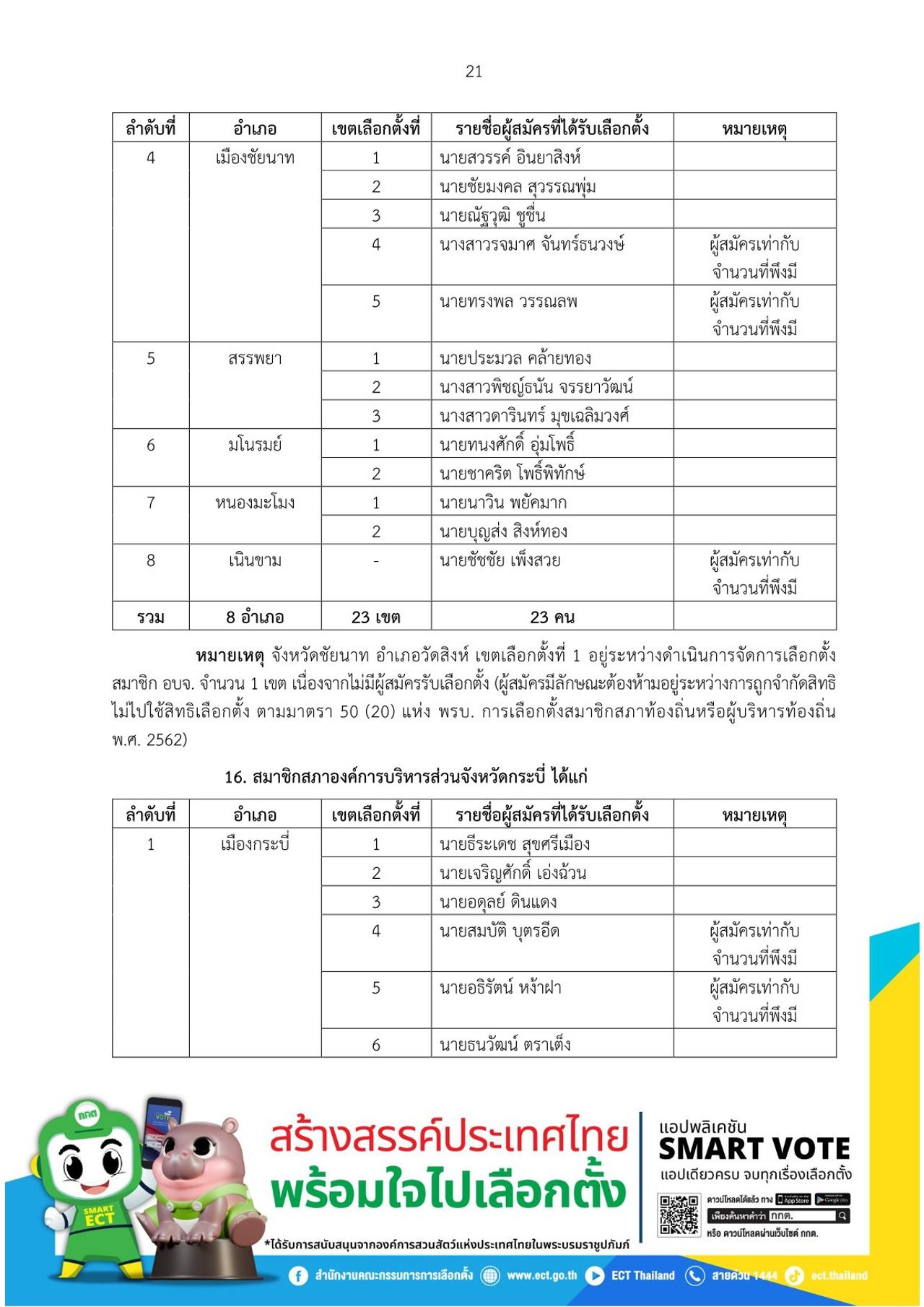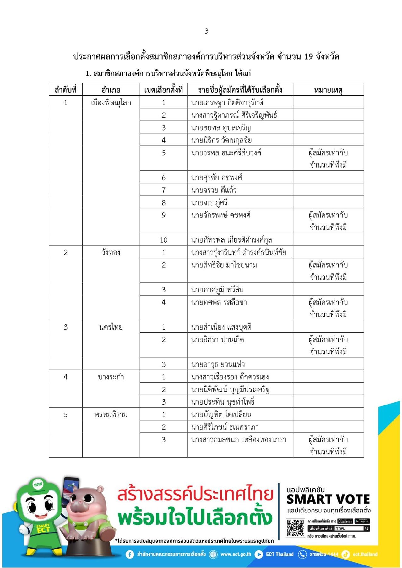 พร้อมกับประกาศผลการเลือกตั้งสมาชิกสภาองค์การบริหารส่วนจังหวัด จำนวน 19 จังหวัด ได้แก่ พิษณุโลก, อุตรดิตถ์, น่าน, หนองคาย, เลย, บึงกาฬ, ร้อยเอ็ด, ศรีสะเกษ, สุรินทร์, อุบลราชธานี, สระแก้ว, อุทัยธานี, นครปฐม, สิงห์บุรี, ชัยนาท, กระบี่, พัทลุง, ยะลา และนราธิวาส