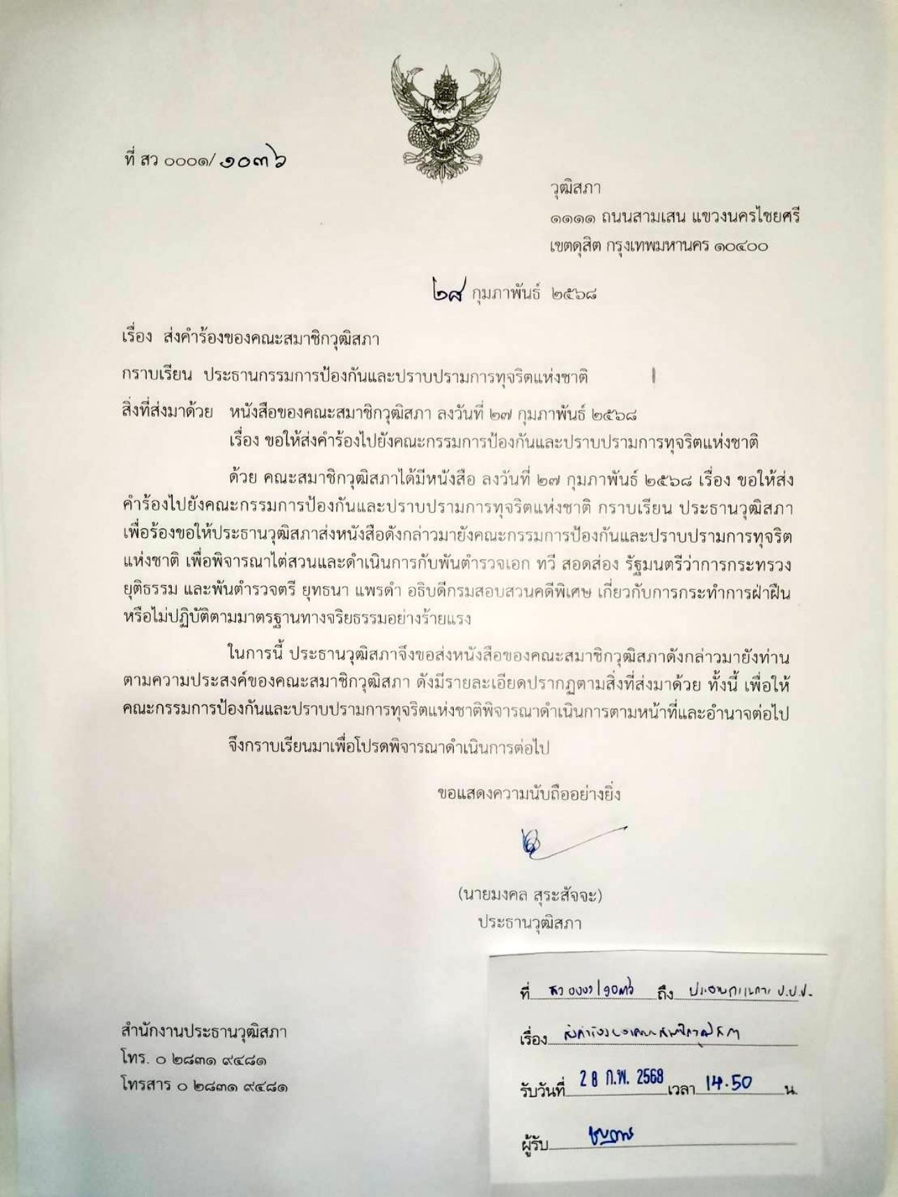 วันที่ 28 ก.พ. 2568 ผู้สื่อข่าวรายงานจากรัฐสภาว่า นายมงคล สุระสัจจะ ประธานวุฒิสภา ได้ทำหนังสือเลขที่ สว 0001/1036 ถึงประธานกรรมการป้องกันและปราบปรามการทุจริตแห่งชาติ (ป.ป.ช.) เนื่องด้วยคณะสมาชิกวุฒิสภาได้มีหนังสือลงวันที่ 27 ก.พ. 2568 เรื่องขอให้ส่งคำร้องไปยังคณะกรรมการป้องกันและปราบปรามการทุจริตแห่งชาติ เพื่อพิจารณาไต่สวนและดำเนินการกับ พ.ต.อ.ทวี สอดส่อง รมว.ยุติธรรม และ พ.ต.ต.ยุทธนา แพรดำ อธิบดีกรมสอบสวนคดีพิเศษ เกี่ยวกับการกระทำการฝ่าฝืน หรือไม่ปฏิบัติตามมาตรฐานทางจริยธรรมอย่างร้ายแรง