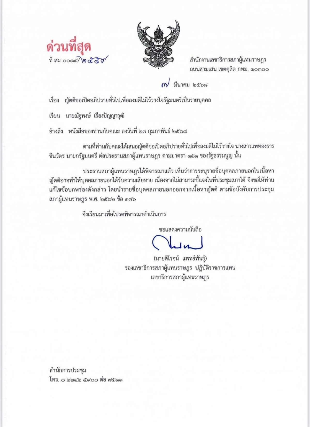 ผู้สื่อข่าวรายงานจากรัฐสภาว่า เมื่อวันที่ 7 มี.ค. 2568 นายวันมูหะมัดนอร์ มะทา ประธานสภาผู้แทนราษฎร ทำหนังสือด่วนที่สุดถึงนายณัฐพงษ์ เรืองปัญญาวุฒิ หัวหน้าพรรคประชาชน ในฐานะผู้นำฝ่ายค้าน กรณีญัตติขอเปิดอภิปรายทั่วไปเพื่อลงมติไม่ไว้วางใจรัฐมนตรีเป็นรายบุคคล ว่า ตามที่ท่านกับคณะได้เสนอญัตติขอเปิดอภิปรายทั่วไป เพื่อลงมติไม่ไว้วางใจ น.ส.แพทองธาร ชินวัตร นายกรัฐมนตรี ต่อประธานสภาผู้แทนราษฎร ตามมาตรา 151 ของรัฐธรรมนูญนั้น ประธานสภาผู้แทนราษฎรพิจารณาแล้ว เห็นว่าการระบุรายชื่อบุคคลภายนอกในเนื้อหาญัตติ อาจทำให้บุคคลภายนอกได้รับความเสียหาย เนื่องจากไม่สามารถชี้แจงในที่ประชุมสภาได้ จึงขอให้แก้ไขข้อบกพร่องดังกล่าว นำรายชื่อบุคคลภายนอกออกจากเนื้อหาญัตติ ตามข้อบังคับการประชุม สภาผู้แทนราษฎร พ.ศ. 2562 ข้อ 176 เพื่อโปรดพิจารณาดำเนินการ ผู้สื่อข่าวรายงานว่า เหตุผลที่ประธานสภาผู้แทนราษฎร ทำหนังสือถึงนายณัฐพงษ์ให้แก้ไขญัตติการยื่นอภิปรายไม่ไว้วางใจนายกรัฐมนตรี เนื่องจากเนื้อหาในญัตติตอนหนึ่ง ระบุว่า “นายกรัฐมนตรีสมัครใจยินยอมให้นายทักษิณ ชินวัตร ผู้เป็นบิดา ชี้นำ ชักใย ให้กระทำการหรืองดเว้นกระทำการอันเป็นเรื่องสำคัญของชาติบ้านเมือง ประพฤติตนเป็นเสมือนนายกรัฐมนตรีหุ่นเชิด โดยมีบิดาเป็นนายกรัฐมนตรีตัวจริงที่ไม่ต้องรับผิดชอบต่อการใช้อำนาจ”