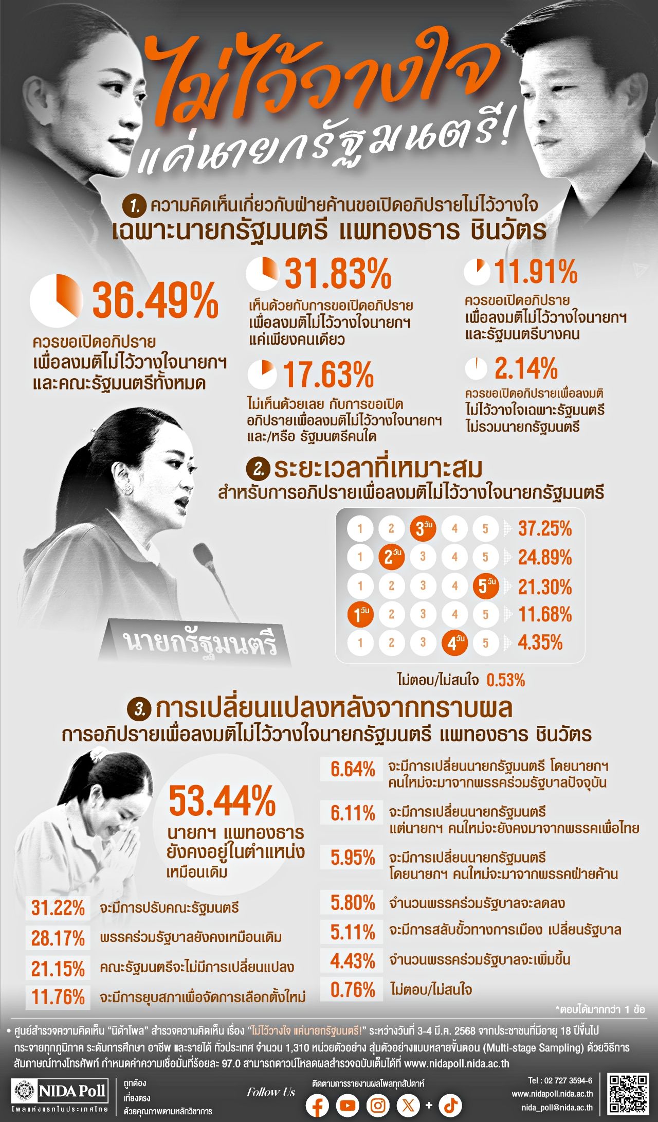 วันที่ 9 มีนาคม 2568 ศูนย์สำรวจความคิดเห็นนิด้าโพล สถาบันบัณฑิตพัฒนบริหารศาสตร์ (นิด้า) เปิดเผยผลการสำรวจเรื่อง “ไม่ไว้วางใจ แค่นายกรัฐมนตรี!” ทำการสำรวจระหว่างวันที่ 3-4 มีนาคม 2568 จากประชาชนที่มีอายุ 18 ปีขึ้นไป กระจายทุกภูมิภาค ระดับการศึกษา อาชีพ และรายได้ทั่วประเทศ รวมจำนวนทั้งสิ้น 1,310 หน่วยตัวอย่าง เกี่ยวกับการเปิดอภิปรายไม่ไว้วางใจเฉพาะ น.ส.แพทองธาร ชินวัตร นายกรัฐมนตรี เก็บข้อมูลด้วยวิธีการสัมภาษณ์ทางโทรศัพท์ โดยกำหนดค่าความเชื่อมั่นร้อยละ 97.0