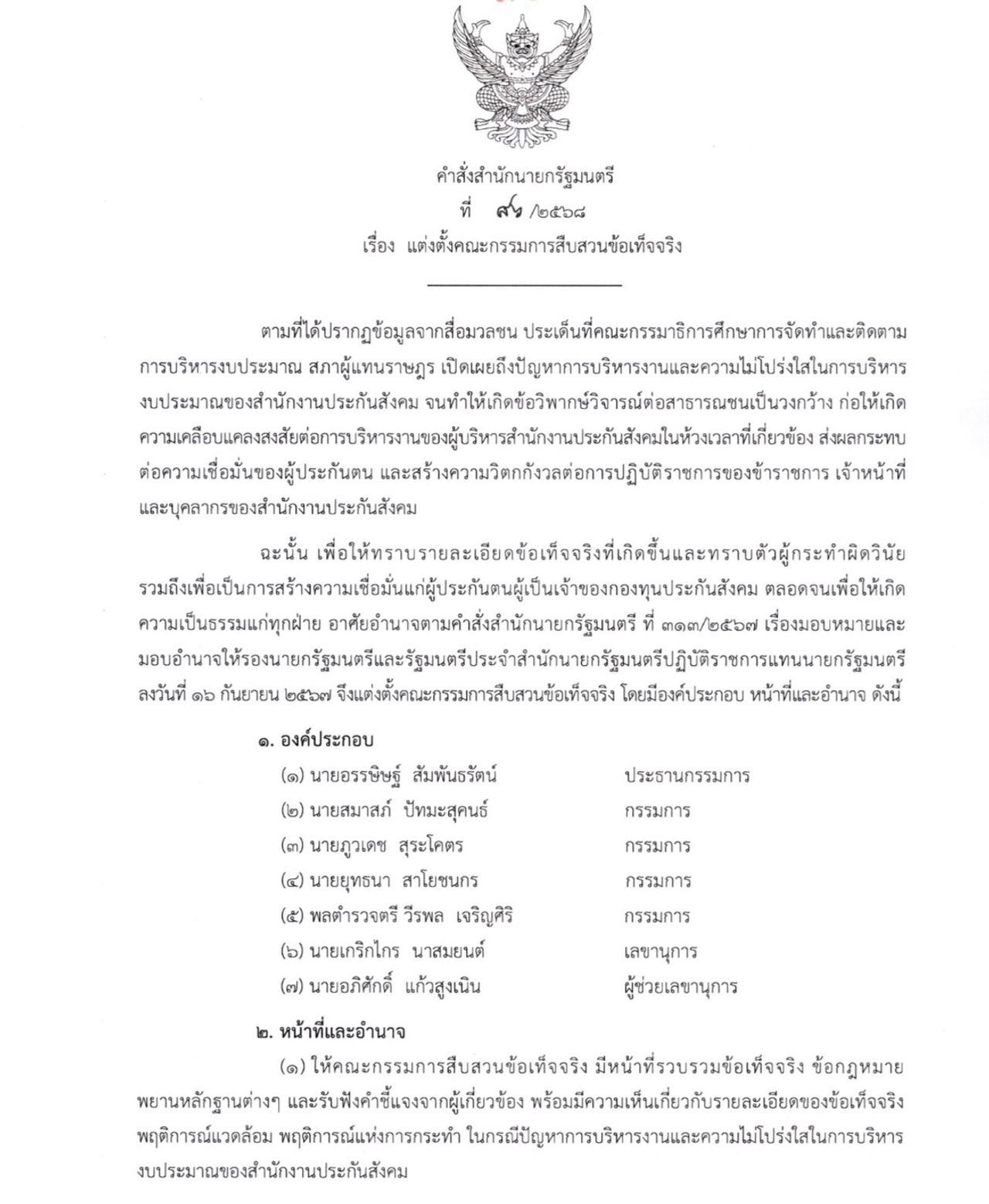 ฉะนั้น เพื่อให้ทราบรายละเอียดข้อเท็จจริงที่เกิดขึ้นและทราบตัวผู้กระทำผิดวินัย รวมถึงเพื่อเป็นการสร้างความเชื่อมั่นแก่ผู้ประกันตนผู้เป็นเจ้าของกองทุนประกันสังคม ตลอดจนเพื่อให้เกิดความเป็นธรรมแก่ทุกฝ่าย อาศัยอำนาจตามคำสั่งสำนักนายกรัฐมนตรี ที่ 313/2567 เรื่องมอบหมายและมอบอำนาจให้รองนายกรัฐมนตรีและรัฐมนตรีประจำสำนักนายกรัฐมนตรีปฏิบัติราชการแทนนายกรัฐมนตรี ลงวันที่ 16 กันยายน 2567 จึงแต่งตั้งคณะกรรมการสืบสวนข้อเท็จจริง โดยมีองค์ประกอบ หน้าที่และอำนาจ ดังนี้