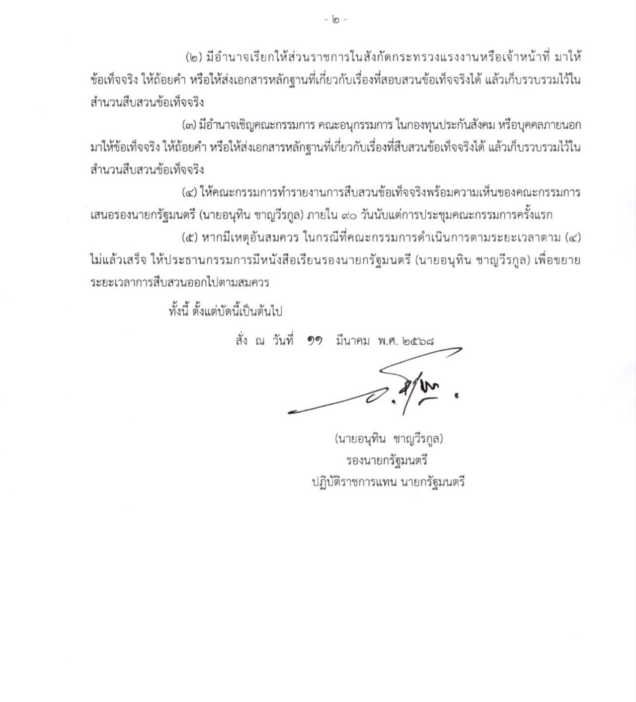 วันที่ 12 มีนาคม 2568 ผู้สื่อข่าวรายงานว่า สำหรับการแต่งตั้งคณะกรรมการสืบสวนข้อเท็จจริงกรณีการใช้งบสำนักงานประกันสังคม (สปส.) นั้น เมื่อวันที่ 11 มีนาคม นายอนุทิน ชาญวีรกูล รองนายกรัฐมนตรี ปฏิบัติราชการแทนนายกรัฐมนตรี ลงนามคำสั่งสำนักนายกรัฐมนตรี ที่ 86/2568 เรื่อง แต่งตั้งคณะกรรมการสืบสวนข้อเท็จจริง มีเนื้อหาว่า