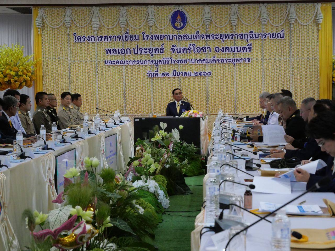 วันที่ 12 มีนาคม 2568 พล.อ.ประยุทธ์ จันทร์โอชา องคมนตรี ในฐานะรองประธานกรรมการมูลนิธิโรงพยาบาลสมเด็จพระยุพราช พร้อมด้วย นายสมศักดิ์ เทพสุทิน รัฐมนตรีว่าการกระทรวงสาธารณสุข นพ.โอภาส การย์กวินพงศ์ ปลัดกระทรวงสาธารณสุข นพ.เอกชัย เพียรศรีวัชรา ผู้ตรวจราชการกระทรวงสาธารณสุข เขตสุขภาพที่ 7 คณะผู้บริหาร และหน่วยงานที่เกี่ยวข้อง ลงพื้นที่ติดตามการดำเนินงานของโรงพยาบาลสมเด็จพระยุพราชกุฉินารายณ์ จังหวัดกาฬสินธุ์ พร้อมเยี่ยมให้กำลังใจบุคลากรผู้ปฏิบัติงาน มอบประกาศเกียรติคุณผู้ทำคุณประโยชน์ให้แก่โรงพยาบาล มอบถุงของขวัญพระราชทานให้กับผู้ป่วย และเปิดห้องผ่าตัด อาคารผ่าตัดเฉลิมพระเกียรติ 72 พรรษา