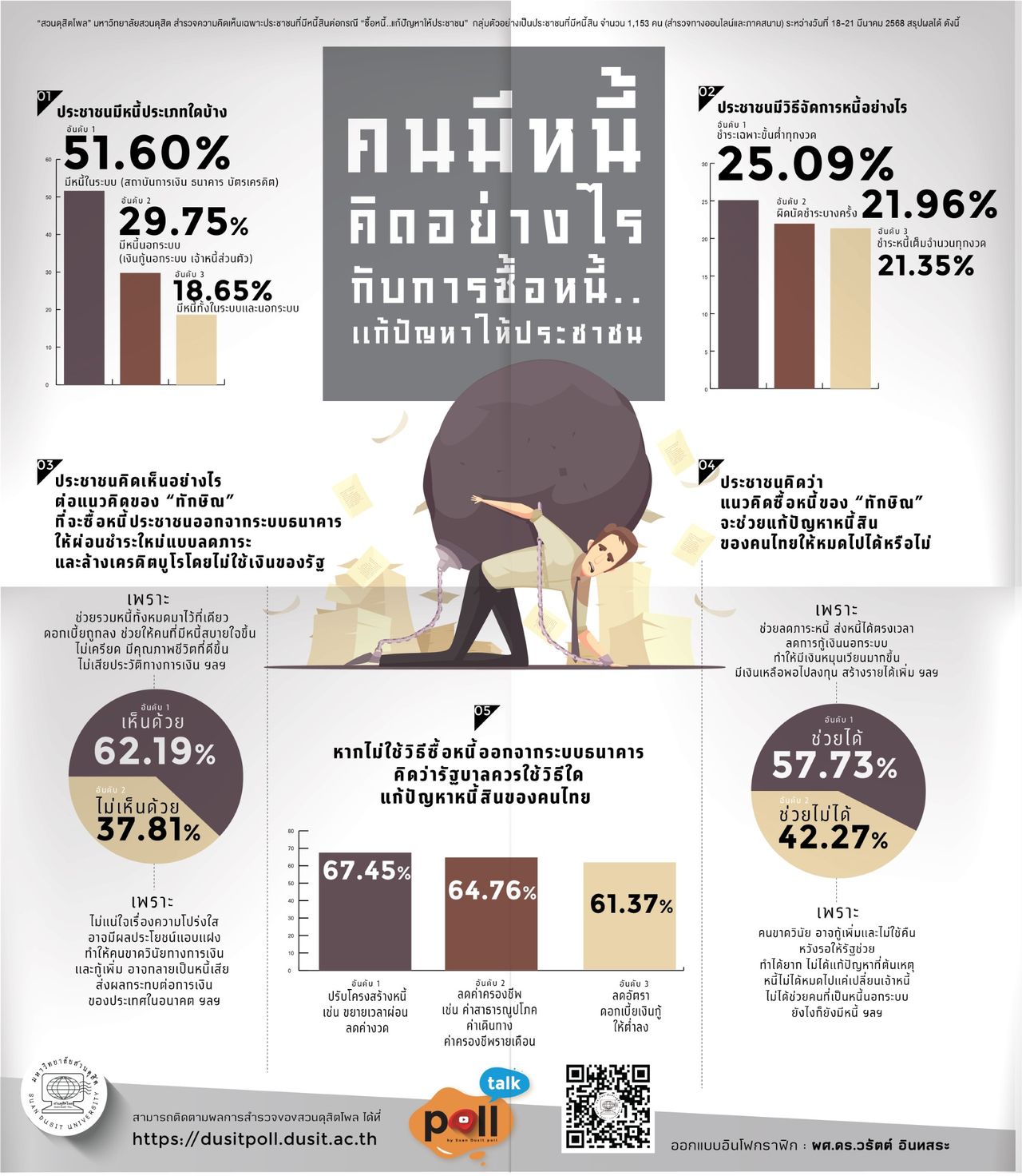 สวนดุสิตโพลเผยผลสำรวจ 62.19% เห็นด้วยแนวคิดซื้อหนี้ของ “ทักษิณ” รวมหนี้ไว้ที่เดียวดอกเบี้ยถูกลง มองว่าช่วยแก้ไขปัญหาหนี้สินได้ ทำให้มีเงินหมุนเวียนมากขึ้น