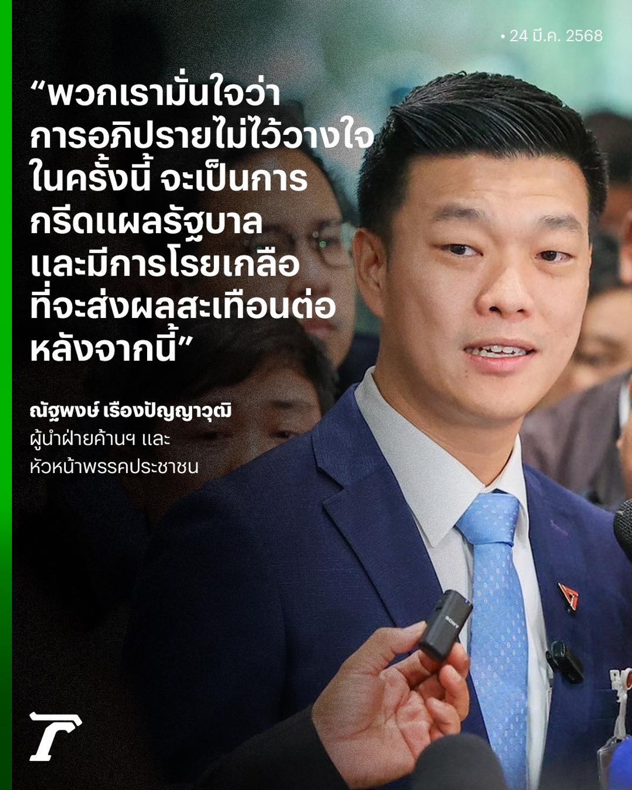วันที่ 24 มีนาคม 2568 เมื่อเวลา 7.30 น. ที่อาคารัฐสภา นายณัฐพงษ์ เรืองปัญญาวุฒิ สส.บัญชีรายชื่อและหัวหน้าพรรคประชาชน ในฐานะผู้นำฝ่ายค้าน ให้สัมภาษณ์กับสื่อมวลชนก่อนการอภิปรายไม่ไว้วางใจว่า มีความพร้อมเต็มที่ มีการเตรียมตัวก่อนหน้านี้มานานแล้ว คนที่จะตอบคำถามว่าพร้อมหรือไม่อาจจะเป็นฝั่งรัฐบาลมากกว่า
