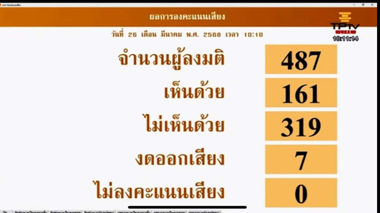 วันที่ 26 มีนาคม 2568 เมื่อเวลา 10.00 น. ที่รัฐสภา มีการประชุมสภาผู้แทนราษฎร มีนายวันมูหะมัดนอร์ มะทา ประธานสภาผู้แทนราษฎร ทำหน้าที่ประธานการประชุม มีวาระสำคัญคือ การลงมติอภิปรายไม่ไว้วางใจ น.ส.แพทองธาร ชินวัตร นายกรัฐมนตรี ตามรัฐธรรมนูญ มาตรา 151 ภายหลังจากการเสร็จสิ้นการอภิปรายไม่ไว้วางใจไปเมื่อวันที่ 24-25 มี.ค. โดยใช้วิธีเสียบบัตรลงคะแนน โดยมีจำนวน สส. ที่ปฏิบัติหน้าที่ได้จำนวน 493 คน ซึ่งการลงมติไม่ไว้วางใจจะต้องได้คะแนนเกินกึ่งหนึ่ง หรือ 247 คะแนนขึ้นไป