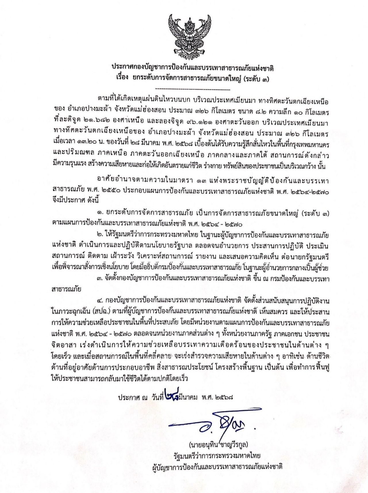 วันที่ 28 มีนาคม 2568 กองบัญชาการป้องกันและบรรเทาสาธารณภัยแห่งชาติ (บกปภ.ช.) ออกประกาศ เรื่อง ยกระดับการจัดการสาธารณภัยขนาดใหญ่ (ระดับ 3) ลงนามโดย นายอนุทิน ชาญวีรกูล รองนายกรัฐมนตรีและรัฐมนตรีว่าการกระทรวงมหาดไทย ในฐานะผู้บัญชาการป้องกันและบรรเทาสาธารณภัยแห่งชาติ ประกาศ ณ วันที่ 28 มีนาคม พ.ศ. 2568 มีเนื้อหาว่า