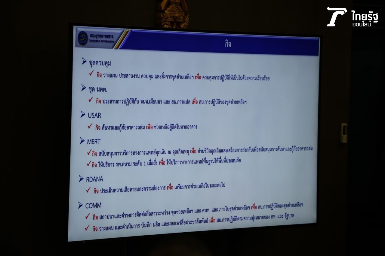 ต่อมา นายภูมิธรรม ให้สัมภาษณ์ว่า ภารกิจนี้เพื่อนมนุษยชาติและมนุษยธรรมในการช่วยดูแลเพื่อนบ้าน ดังนั้นครั้งนี้ดูแลทั้งภายในประเทศและนอกประเทศ โดยสถานการณ์ในเมียนมาถือว่าตอนนี้ยังสับสน เนื่องจากเมียนมาสถานการณ์รุนแรงกว่าประเทศไทยมาก ซึ่งในพื้นที่เมืองมัณฑะเลย์ เนปิดอว์ และกรุงย่างกุ้ง ซึ่งกำลังรวบรวมข้อมูล และหากชุดนี้ไปปฏิบัติงานก็จะมีการประสานกับทางสถานทูตไทยในเมียนมา โดยจะรายงานกลับมาให้ทางไทยทราบต่อไปเป็นระยะ แต่ทั้งนี้ ยังไม่ได้รับรายงานคนไทยบาดเจ็บหรือเสียชีวิตจากเหตุการณ์แผ่นดินไหวในเมียนมา