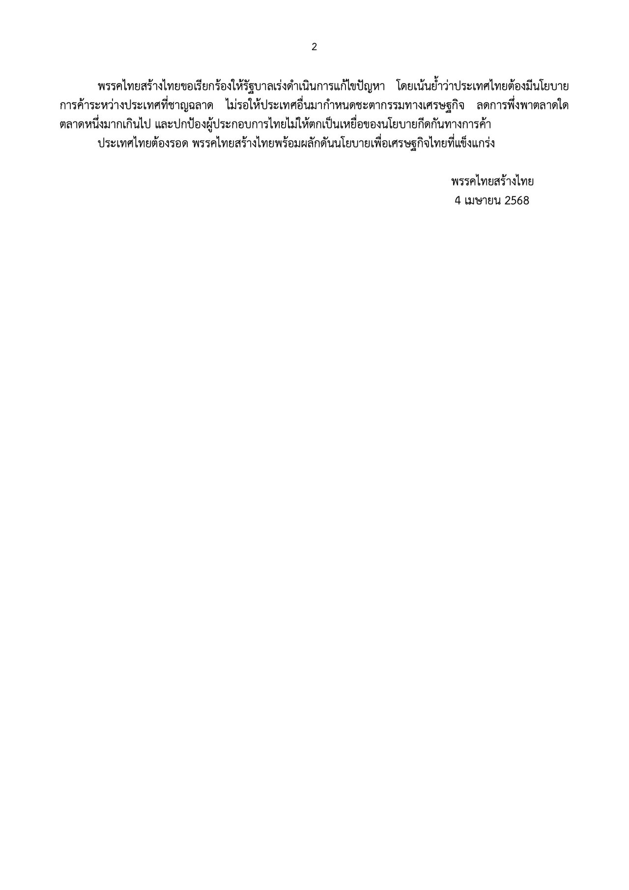 พรรคไทยสร้างไทยขอเรียกร้องให้รัฐบาลเร่งดำเนินการแก้ไขปัญหา โดยเน้นย้ำว่าประเทศไทยต้องมีนโยบายการค้าระหว่างประเทศที่ชาญฉลาด ไม่รอให้ประเทศอื่นมากำหนดชะตากรรมทางเศรษฐกิจ ลดการพึ่งพาตลาดใดตลาดหนึ่งมากเกินไป และปกป้องผู้ประกอบการไทยไม่ให้ตกเป็นเหยื่อของนโยบายกีดกันทางการค้า ประเทศไทยต้องรอด พรรคไทยสร้างไทยพร้อมผลักดันนโยบายเพื่อเศรษฐกิจไทยที่แข็งแกร่ง.
