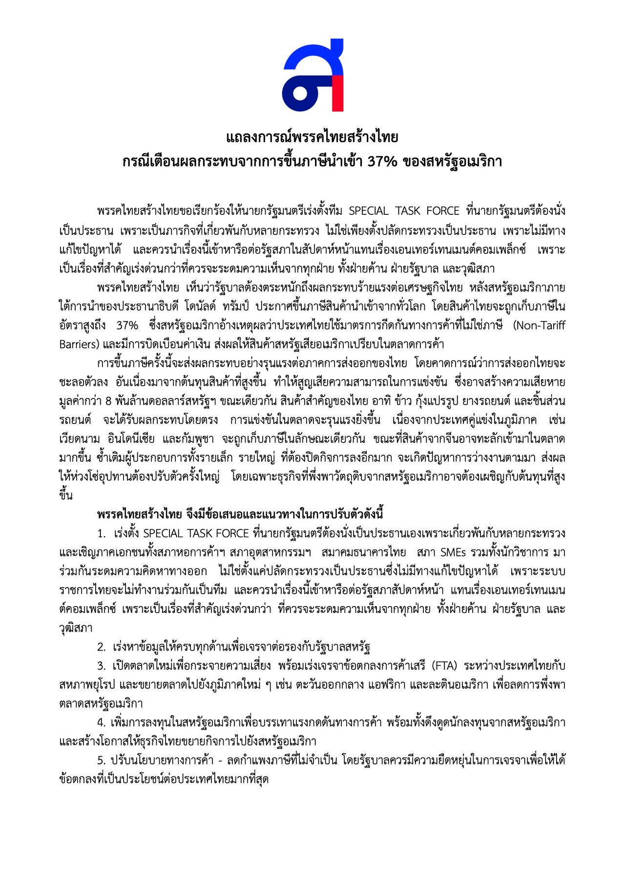 ไทยสร้างไทยออกแถลงการณ์ หวั่นผลกระทบ สหรัฐฯ ตั้งกำแพงภาษีไทยสูง 37% บี้ “นายกฯ” เร่งนำเข้าหารือในรัฐสภาสัปดาห์หน้า แทนเอ็นเทอร์เทนเมนต์คอมเพล็กซ์ เพราะสำคัญเร่งด่วนกว่า แนะทำ 5 ข้อ ย้ำ ไทยต้องมีนโยบายการค้าระหว่างประเทศที่ชาญฉลาด
