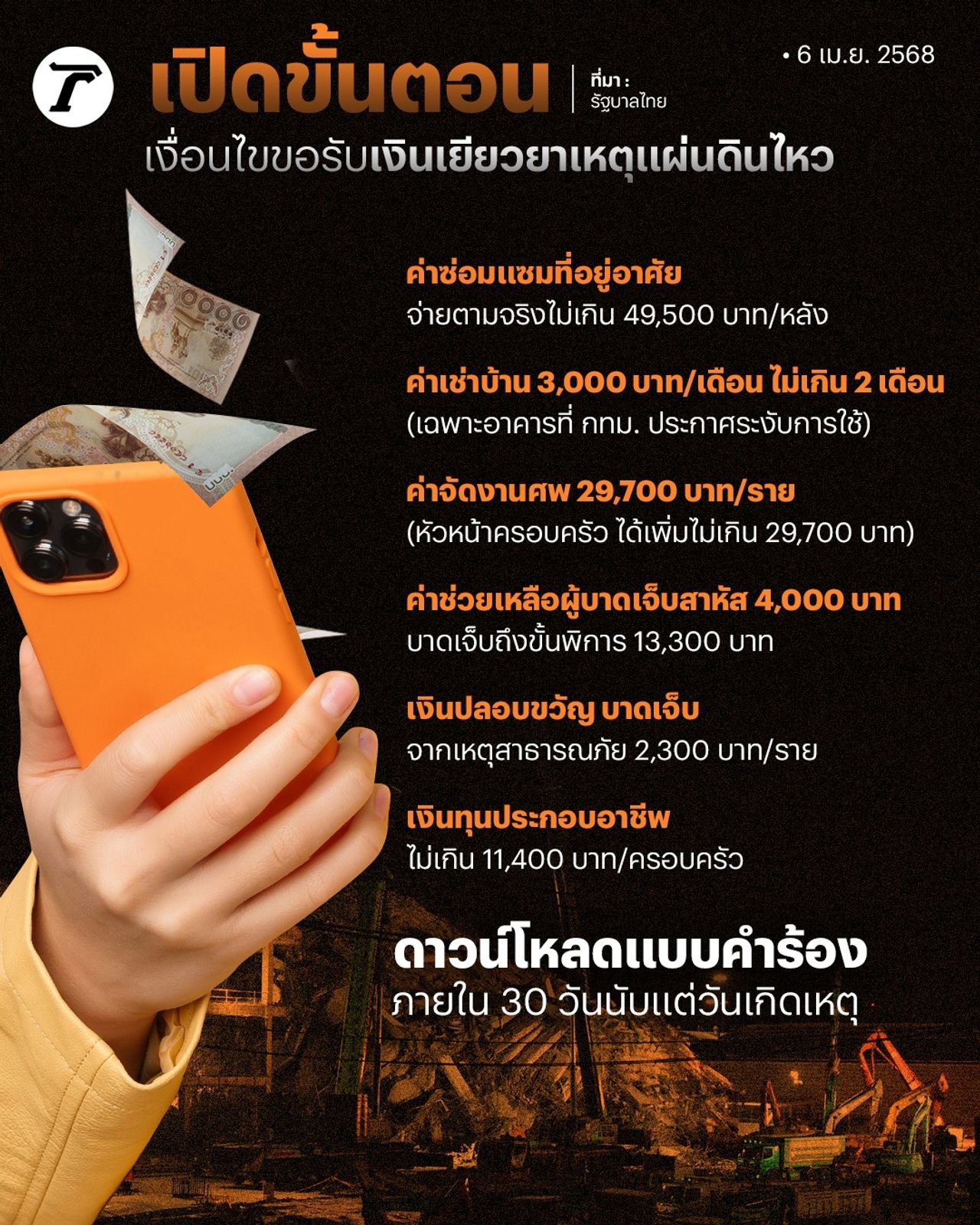 วันที่ 6 เม.ย. 2568 นางสาวศศิกานต์ วัฒนะจันทร์ รองโฆษกประจำสำนักนายกรัฐมนตรีเปิดเผยว่า รัฐบาลระดมทุกสรรพกำลังในการให้ความช่วยเหลือผู้ประสบภัยจากเหตุแผ่นดินไหวอย่างเต็มที่ โดยภารกิจค้นหา ให้ความช่วยเหลือยังคงดำเนินการอย่างต่อเนื่องควบคู่ไปกับการเยียวยาและสนับสนุนการซ่อมแซมที่อยู่อาศัยอย่างเร่งด่วน โดยทางกรุงเทพมหานคร (กทม.) ได้กำหนดแนวทางการให้ความช่วยเหลือ พร้อมเปิดเงื่อนไขและขั้นตอนในการขอรับเงินช่วยเหลือครอบคลุมในหลายด้าน อาทิ ค่าซ่อมแซมที่พักอาศัย เงินปลอบขวัญ และเงินทุนสำหรับการประกอบอาชีพ เพื่อฟื้นฟูคุณภาพชีวิตของผู้ประสบภัยโดยเร็ว