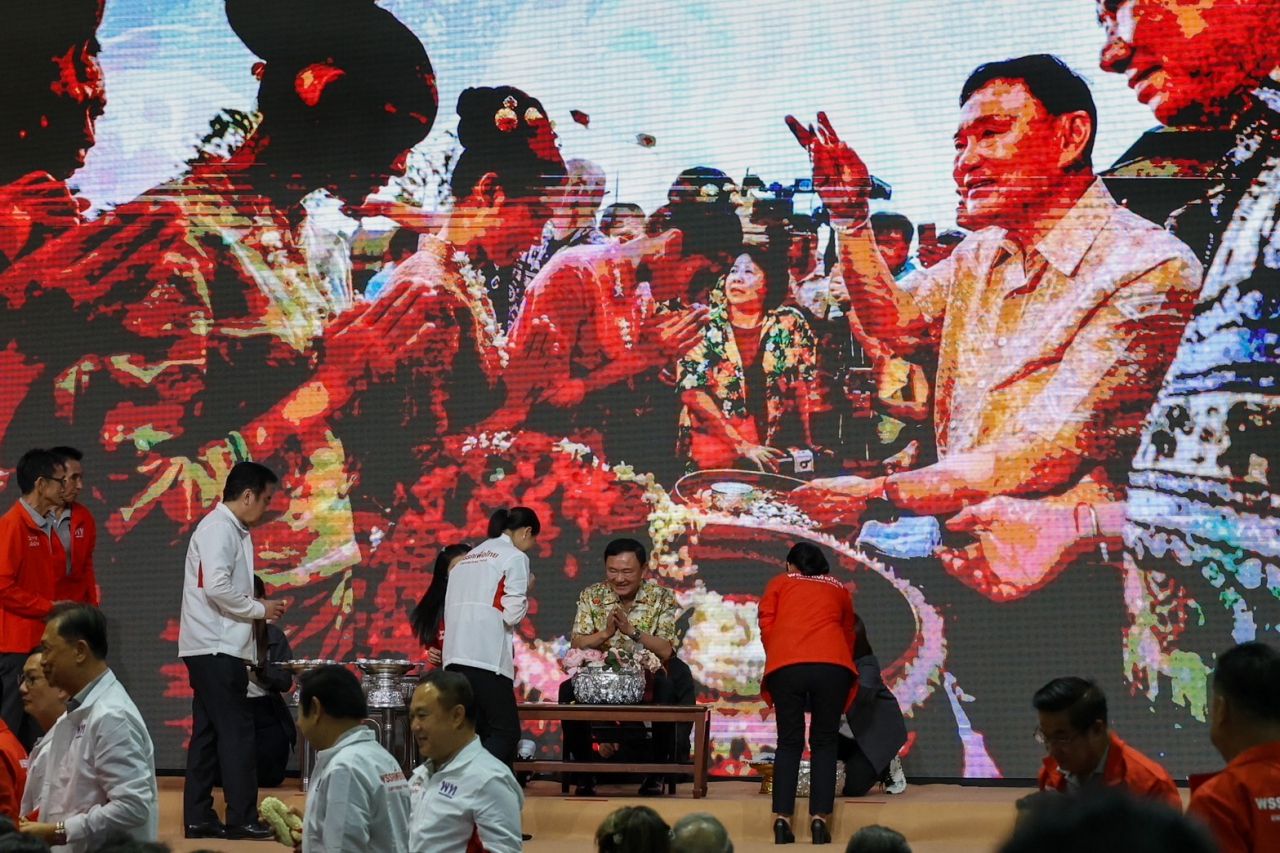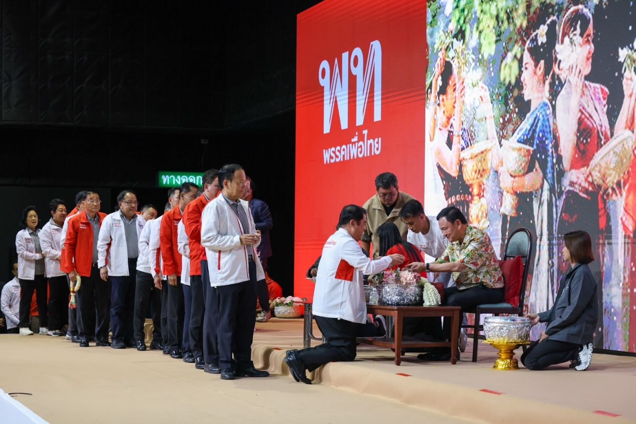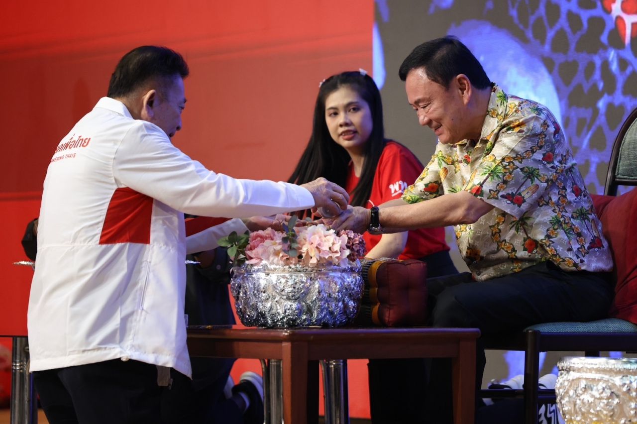 “ทักษิณ” ประชุมพรรคเพื่อไทย ขอแรงช่วยกันขับเคลื่อนวิกฤตเศรษฐกิจ ด้าน “แพทองธาร” นำ ส.ส.-สมาชิกพรรค รดน้ำดำหัวขอพรเนื่องในวันสงกรานต์ สวมกอดหอมแก้มชื่นมื่น