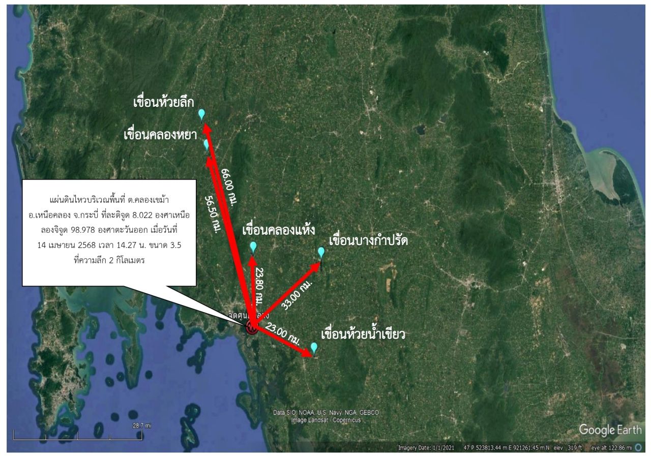 วันที่ 14 เม.ย. 2568 เวลา 22.00 น. นางนฤมล ภิญโญสินวัฒน์ รัฐมนตรีว่าการกระทรวงเกษตรและสหกรณ์ กล่าวว่า จากเหตุแผ่นดินไหว เมื่อเวลา 14.27 น. โดยมีจุดศูนย์กลางอยู่ที่ ต.คลองเขม้า อ.เหนือคลอง จ.กระบี่ (8.02°N, 98.98°E) ขนาด 3.5 ริกเตอร์ ลึก 2 กม. นั้น ตนได้รับรายงานจากสำนักสำรวจด้านวิศวกรรมและธรณีวิทยา กรมชลประทานในพื้นที่โครงการชลประทานกระบี่ สำนักงานชลประทานที่ 15 พบความเร่งสูงสุดที่ตรวจวัดได้มีค่าเท่ากับ 0.03913g ซึ่งเขื่อนกรมชลประทานได้ออกแบบเพื่อรองรับแรงสั่นสะเทือนไว้ 0.2g ที่จะส่งผลกระทบต่อตัวเขื่อน