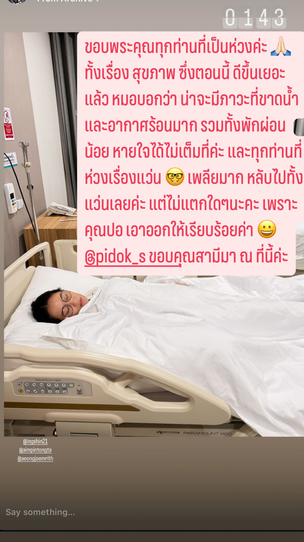 น.ส.แพทองธาร ระบุข้อความบนภาพดังกล่าวว่า “ขอบพระคุณทุกท่านที่เป็นห่วงค่ะ ทั้งเรื่องสุขภาพ ซึ่งตอนนี้ดีขึ้นเยอะแล้ว หมอบอกว่าน่าจะมีภาวะที่ขาดน้ำ และอากาศร้อนมาก รวมทั้งพักผ่อนน้อย หายใจได้ไม่เต็มที่ค่ะ และทุกท่านที่ห่วงเรื่องแว่น เพลียมาก หลับไปทั้งแว่นเลยค่ะ แต่ไม่แตกใดๆ นะคะ เพราะคุณปอเอาออกให้เรียบร้อยค่า @pidok_s ขอบคุณสามีมา ณ ที่นี้ค่ะ”