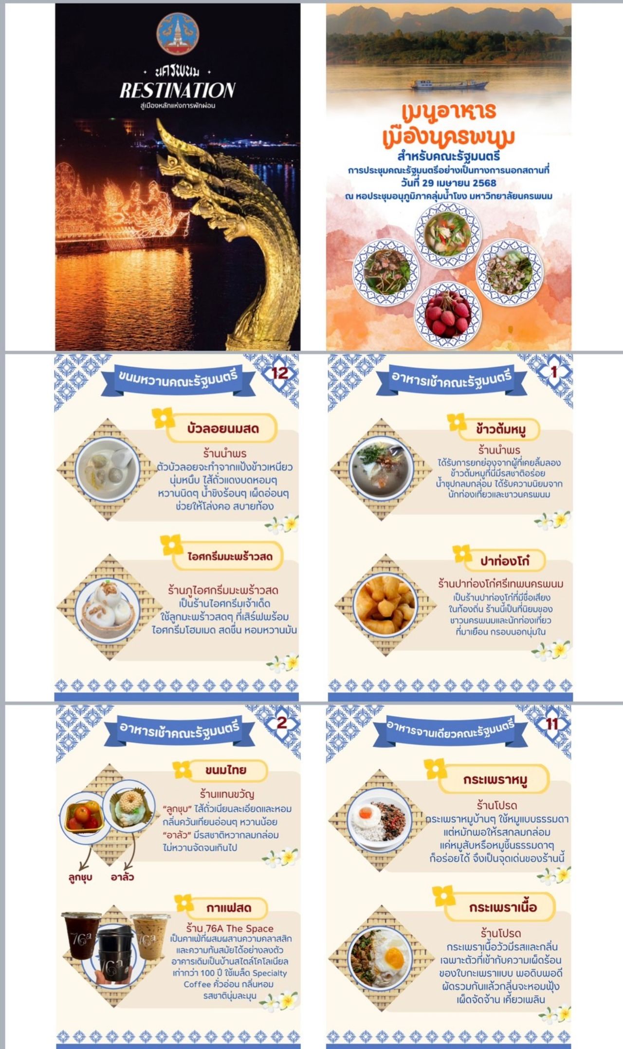 สำหรับเมนูอาหารที่จัดเลี้ยง ครม. ประกอบด้วย ต้มส้มไก่บ้านใบมะขาม ฉู่ฉี่ปลาเนื้ออ่อน ก๋วยเตี๋ยวเนื้อ ก๋วยเตี๋ยวหมู (ร้านนำพร) ปากหม้อเวียดนาม (ร้านปากหม้อแม่ลาน) ลาบปลาคัง (ร้านเป๋นปลาเป็น) ตำลาว (ร้านอีสานรีเวอร์) ข้าวเหนียวไก่ย่าง (ร้านสามอนงค์) พุดดิ้งหม้อแกง (ร้านเทียนขวัญ) สับปะรดท่าอุเทน ลิ้นจี่พันธุ์ นพ.1 (GI) ขนมเทียนสลัดงา กาละแม (ร้านพรประเสริฐ) ฯลฯ จากร้านอาหารขึ้นชื่อต่าง ๆ ในท้องถิ่น