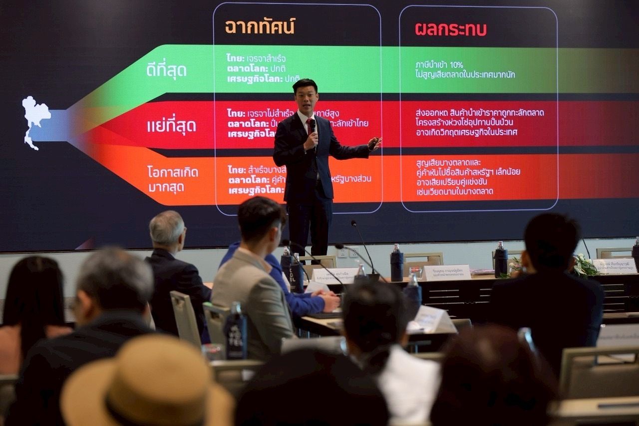 วันที่ 30 เมษายน 2568 ที่โรงแรมโนโวเทล ประตูน้ำ นายณัฐพงษ์ เรืองปัญญาวุฒิ ส.ส. บัญชีรายชื่อ หัวหน้าพรรคประชาชน ในฐานะผู้นำฝ่ายค้าน กล่าวหัวข้อ “แนวทางขับเคลื่อนเศรษฐกิจไทย ปี 2568: รับมือกำแพงภาษีและสงครามการค้า” ว่า หน้าที่ ส.ส. ทุกคนขณะนี้ควรส่งข้อเสนอดีที่สุดไปยังคณะผู้แทนเจรจาไทยที่จะเดินทางไปต่อรองกับสหรัฐอเมริกาให้ประเทศไทยได้รับประโยชน์สูงสุด รับมือห่วงโซ่อุปทานใหม่ในการค้าโลก ที่ผ่านมาหลายประเทศเดินทางไปเจรจากับสหรัฐฯ เช่น ญี่ปุ่น มาเลเซีย เกาหลี อินเดีย แม้การเจรจาอาจยังไม่ชัดเจน แต่ประเทศเหล่านี้เริ่มต้นแล้ว ขณะที่ไทยยังไม่ได้เริ่มเจรจา การเริ่มช้ามีข้อเสียเปรียบหลายด้าน ขณะที่ผู้ค้าอื่นบรรลุผลเจรจากับสหรัฐฯ แล้ว เท่ากับไพ่ในมือเราจะเหลือน้อยลงทุกวัน สิ่งที่ไทยต้องประเมินคือ ฉากทัศน์แย่ที่สุด หากการเจรจากับสหรัฐฯ ไม่ประสบความสำเร็จ ทีมไทยแลนด์ต้องวางมาตรการป้องกันเหตุการณ์ที่แย่ที่สุด ขอฝากยุทธศาสตร์ 5 เสาไปยังทีมเจรจารัฐบาลคือ 1. การเจรจา ถ้าต้องยอมนำเข้าสินค้าบางอย่างจากสหรัฐฯ ต้องไม่ส่งผลกระทบต่อผู้บริโภค 2. การกระชับ ต้องมีการค้าที่เป็นธรรม พัฒนาคุณภาพ เปลี่ยนจากคู่แข่งเป็นคู่หูพัฒนาประเทศร่วมกัน 3. การรับมือผลกระทบทางตรงจากการเจรจา ปัจจัยในการนำเข้าสินค้า รักษามาตรฐานสินค้าและเสถียรภาพสินค้า 4. การเยียวยาช่วยเหลือคนเสียประโยชน์ 5. การลงทุนต้องตอบโจทย์ภูมิรัฐศาสตร์ให้สอดรับระเบียบโลกใหม่ เชื่อว่าทีมไทยแลนด์ดำเนินการทุกอย่างไปพร้อมกันได้ ให้ไทยได้ประโยชน์สูงสุด