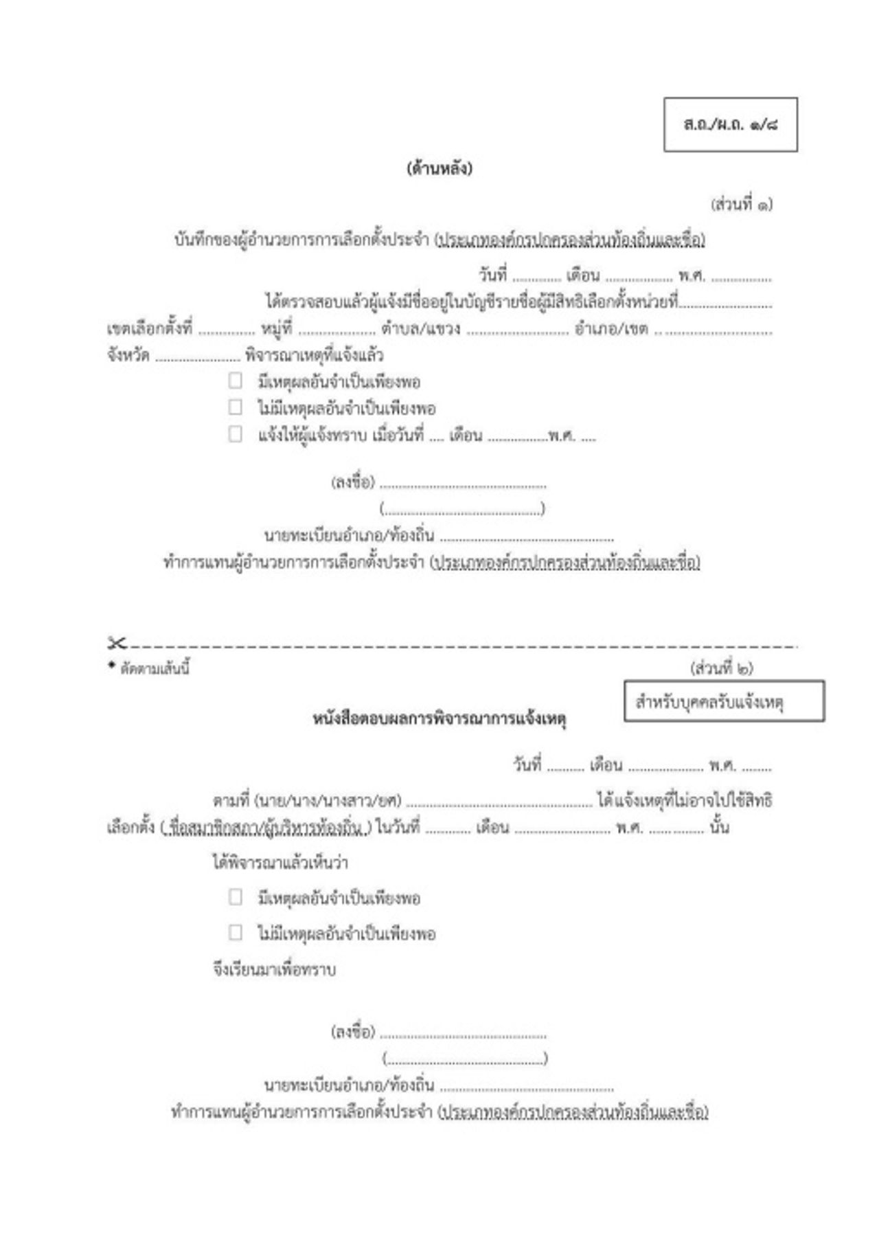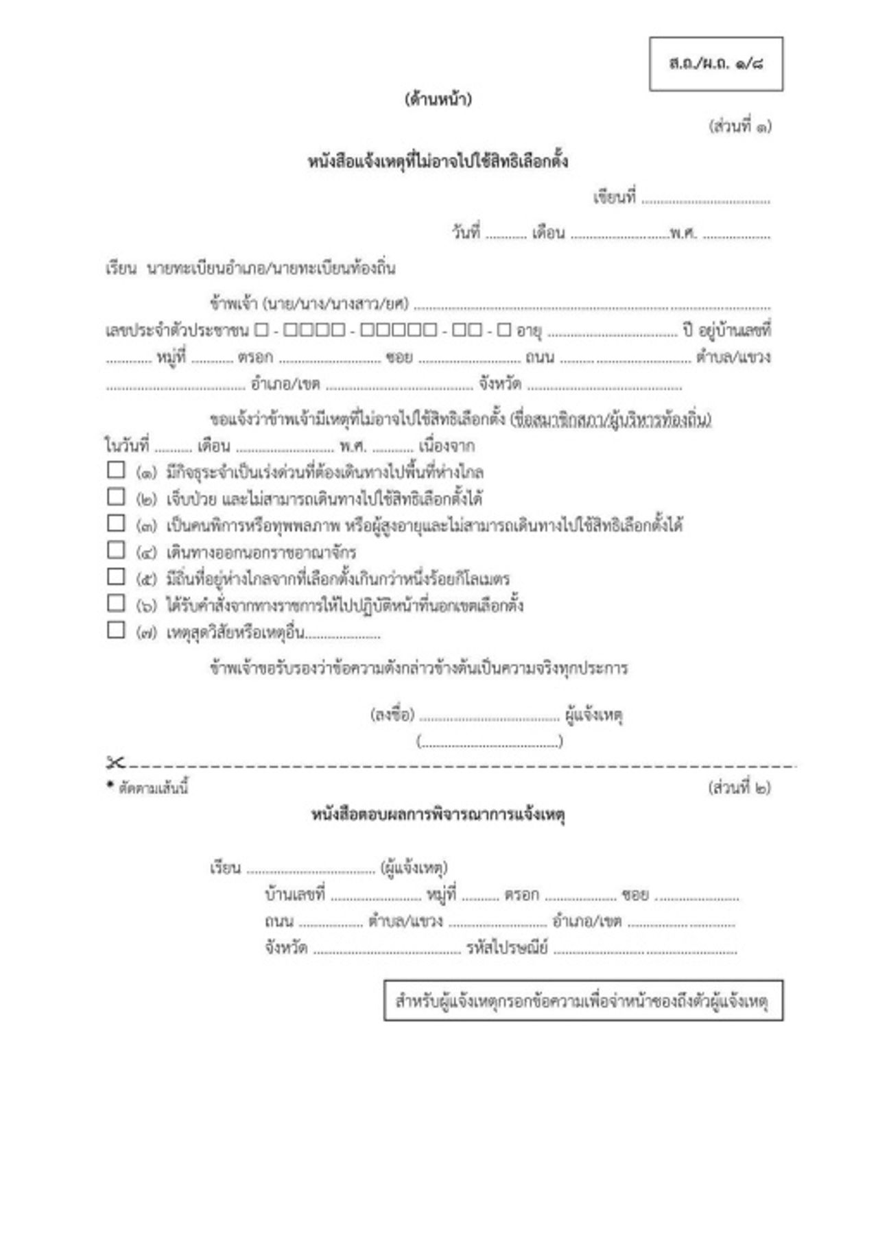 ส่วนผู้มีสิทธิเลือกตั้งเทศบาล 2568 ที่ไม่อาจไปใช้สิทธิเลือกตั้งสมาชิกสภาเทศบาลและนายกเทศมนตรี ในวันอาทิตย์ที่ 11 พฤษภาคม 2568 สามารถแจ้งเหตุที่ไม่อาจไปใช้สิทธิเลือกตั้งได้ในรอบแรกตั้งแต่วันนี้ - 10 พฤษภาคม 2568 รอบสอง ตั้งแต่วันที่ 12 - 18 พฤษภาคม 2568 โดยไม่เว้นวันหยุดราชการ ตามแบบ ส.ถ./ผ.ถ. 1/8 (เอกสารแนบ) หรือทำเป็นหนังสือซึ่งอย่างน้อยต้องระบุหมายเลขประจำตัวประชาชน และที่อยู่ตามหลักฐานทะเบียนบ้านให้ชัดเจน พร้อมทั้งแจ้งด้วยว่าไม่อาจไปใช้สิทธิเลือกตั้งได้ด้วยเหตุใด โดยยื่นต่อนายทะเบียนอำเภอหรือนายทะเบียนท้องถิ่นที่ตนเป็นผู้มีสิทธิเลือกตั้งด้วยตนเอง หรือทำเป็นหนังสือมอบหมายให้บุคคลอื่นไปยื่นแทน หรือวิธีที่ง่ายและสะดวกรวดเร็วยื่นผ่านแอปพลิเคชัน Smart Vote