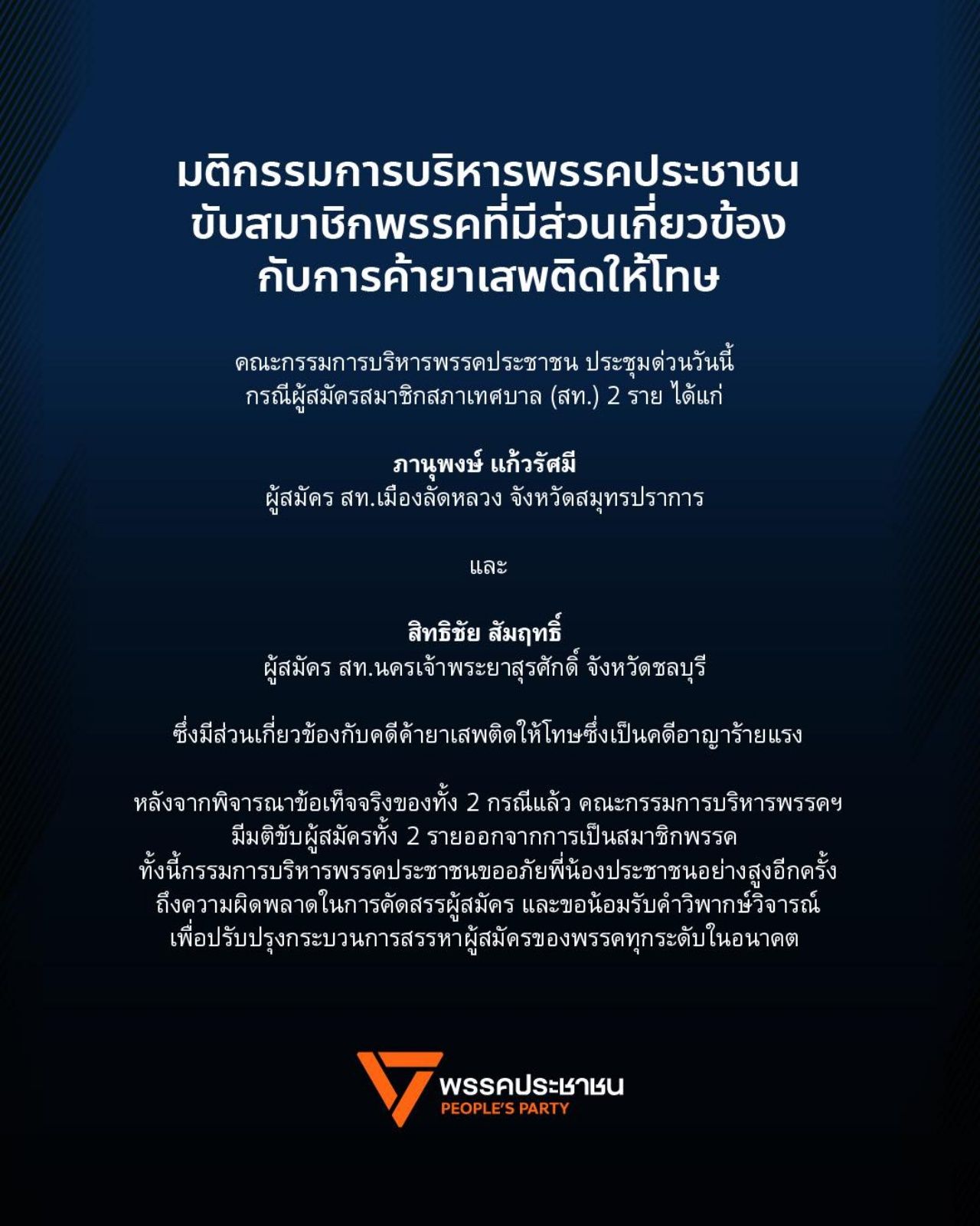 ล่าสุดพรรคประชาชนแจ้งผ่านเฟซบุ๊กว่า คณะกรรมการบริหารพรรคมีมติขับ นายภานุพงษ์ แก้วรัศมี ผู้สมัคร สท.เมืองลัดหลวง จังหวัดสมุทรปราการและสิทธิชัย สัมฤทธิ์ ผู้สมัคร สท.นครเจ้าพระยาสุรศักดิ์ จังหวัดชลบุรี ซึ่งมีส่วนเกี่ยวข้องกับคดีค้ายาเสพติดให้โทษซึ่งเป็นคดีอาญาร้ายแรง ทั้งนี้กรรมการบริหารพรรคประชาชนขออภัยพี่น้องประชาชนอย่างสูงอีกครั้งถึงความผิดพลาดในการคัดสรรผู้สมัคร และขอน้อมรับคำวิพากษ์วิจารณ์ เพื่อปรับปรุงกระบวนการสรรหาผู้สมัครของพรรคทุกระดับในอนาคต