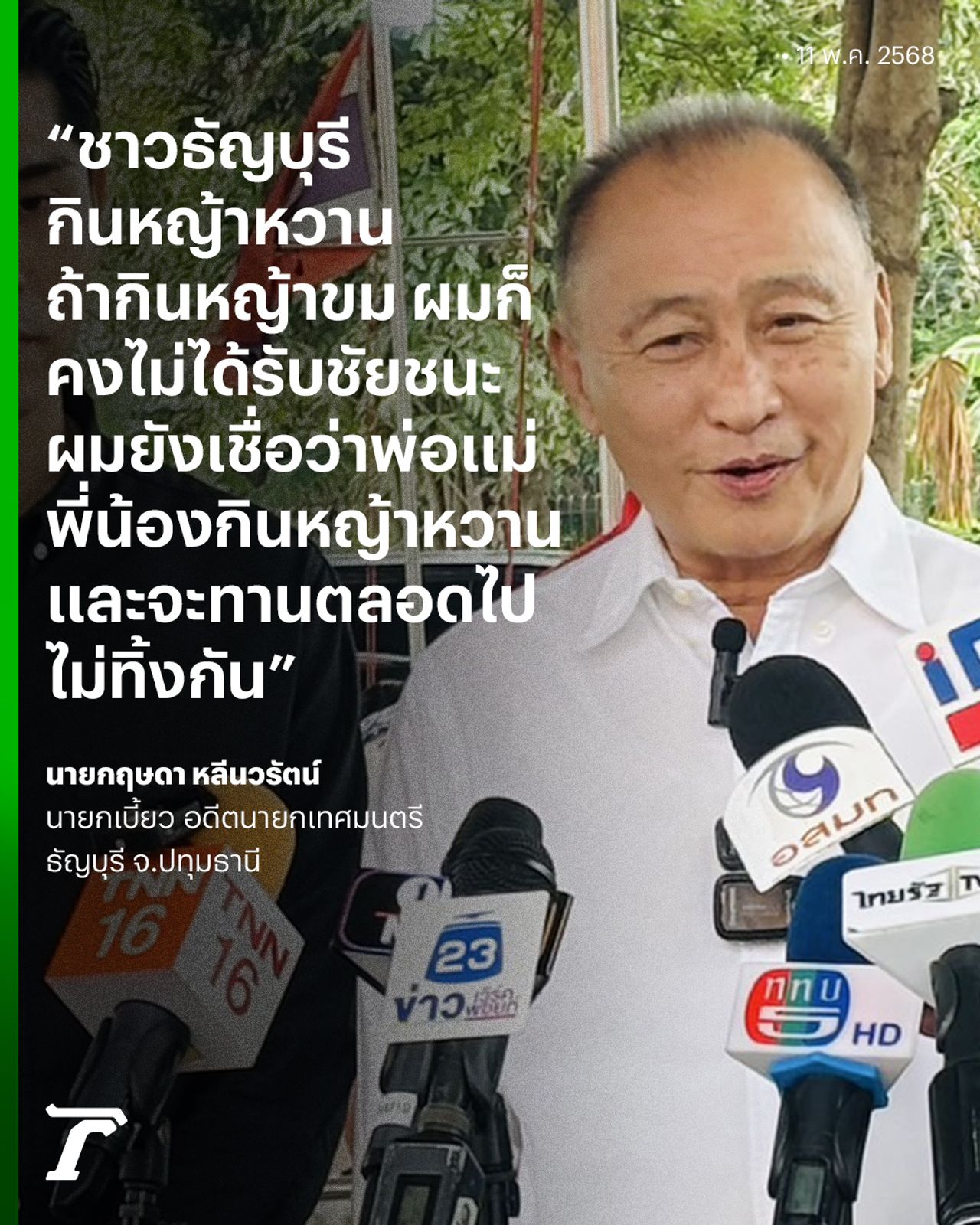 วันที่ 12 พฤษภาคม 2568 ผู้สื่อข่าวรายงานว่าภายหลังการแถลงข่าวรับชัยชนะในการเลือกตั้งเทศบาลตำบลธัญบุรี ของ นายกฤษดา หลีนวรัตน์ หรือ นายกเบี้ยว นางยุพเยาว์ หลีนวรัตน์ ผู้สมัครรับเลือกตั้งเป็นนายกเทศมนตรีตำบลธัญบุรี และนายสมิทธิพัฒน์ หลีนวรัตน์ หรือ พีช ผู้สมัครรับเลือกตั้งเป็นสมาชิกสภาเทศบาลตำบลธัญบุรี เมื่อวานนี้ (11 พฤษภาคม 2568) ต่างมีการแสดงความเห็นถึงประเด็น “หญ้าหวาน” ที่ นายกฤษดา ได้กล่าวไว้ตอนหนึ่งว่า “ชาวธัญบุรี กินหญ้าหวาน ถ้ากินหญ้าขม ผมก็คงไม่ได้รับชัยชนะ ผมยังเชื่อว่าพ่อแม่พี่น้องกินหญ้าหวาน และจะทานตลอดไปไม่ทิ้งกัน”