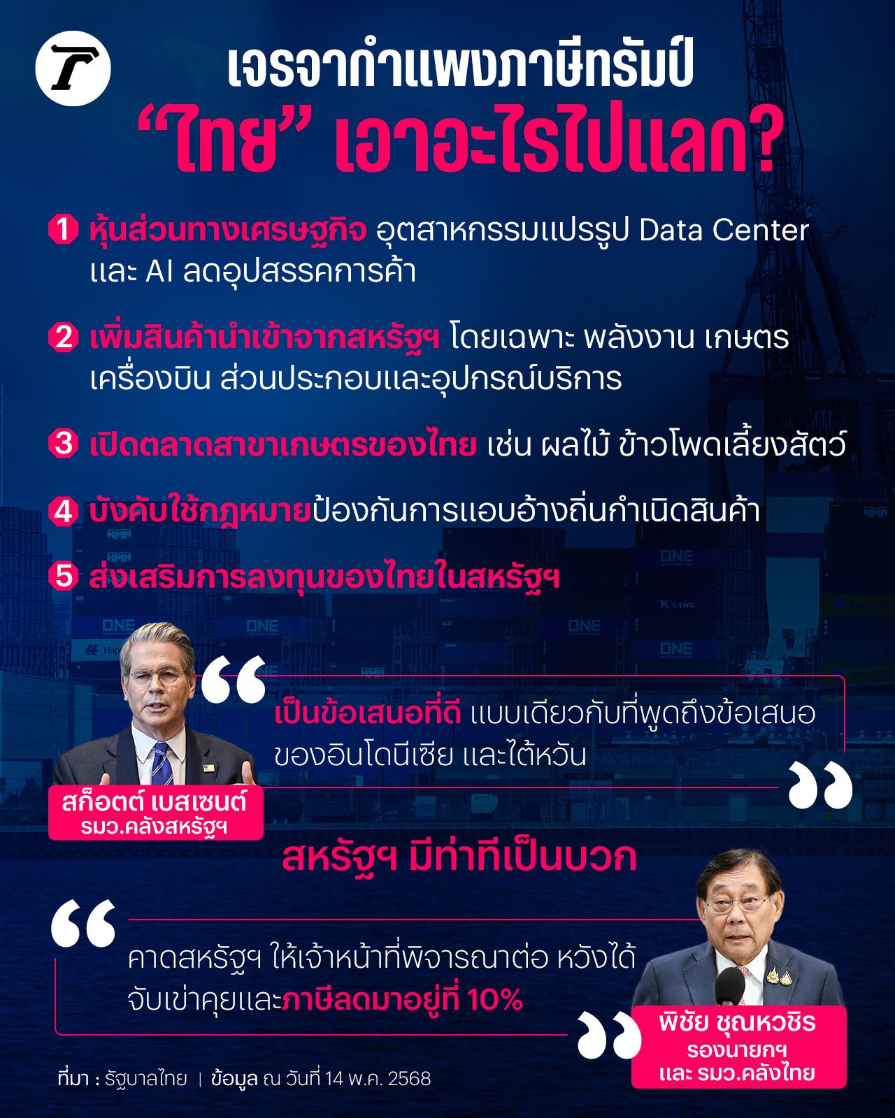 วันที่ 14 พฤษภาคม 2568 เมื่อเวลา 13.00 น. ที่ทำเนียบรัฐบาล นายพิชัย ชุณหวชิร รองนายกรัฐมนตรีและรมว.คลัง ให้สัมภาษณ์ถึงความคืบหน้าการเจรจาเรื่องกำแพงภาษีกับสหรัฐอเมริกาว่า ประเทศไทยยื่นข้อเสนอให้สหรัฐฯ ผ่านนายพิชัย นริพทะพันธุ์ รมว.พาณิชย์ ถึงนายเจมสัน กรีเออร์ ประธานผู้แทนการค้าสหรัฐฯ (USTR) ตั้งแต่วันที่ 8 พ.ค. เนื้อหาเสนอกรอบการหารือที่ผ่านการพิจารณาจากคณะทำงานนโยบายการค้า และผ่านความเห็นชอบจากนายกฯ ประกอบไปด้วยการเจรจา 5 เสาหลัก ได้แก่