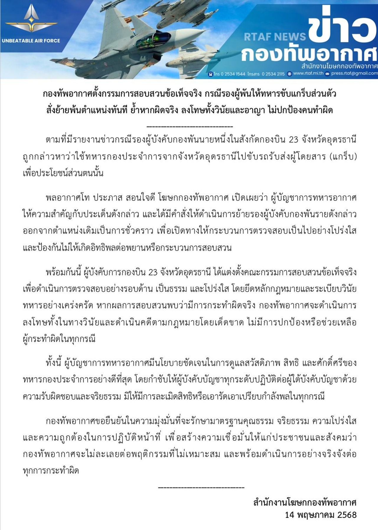 กองทัพอากาศขอยืนยันในความมุ่งมั่นที่จะรักษามาตรฐานคุณธรรม จริยธรรม ความโปร่งใส และความถูกต้องในการปฏิบัติหน้าที่ เพื่อสร้างความเชื่อมั่นให้แก่ประชาชนและสังคมว่า กองทัพอากาศจะไม่ละเลยต่อพฤติกรรมที่ไม่เหมาะสม และพร้อมดำเนินการอย่างจริงจังต่อทุกการกระทำผิด.