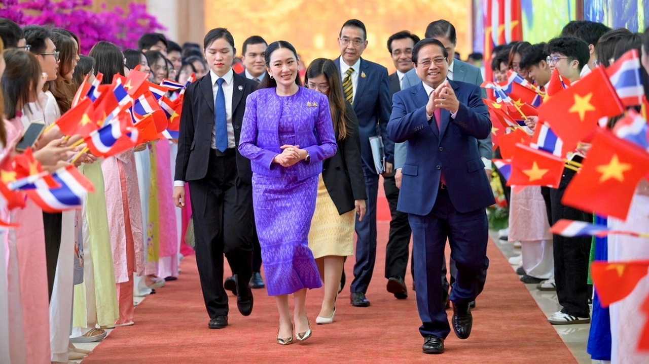 น.ส.แพทองธาร ชินวัตร นายกฯ และนายฝ่าม มิงห์ จิ๋งห์ นายกฯเวียดนาม เดินทักทายผู้แทนภาครัฐ ภาคเอกชน และองค์กรธุรกิจชั้นนำ ที่เข้าร่วมสัมมนาทางธุรกิจไทย-เวียดนาม ที่โรงแรม Melia Hanoi กรุงฮานอย.