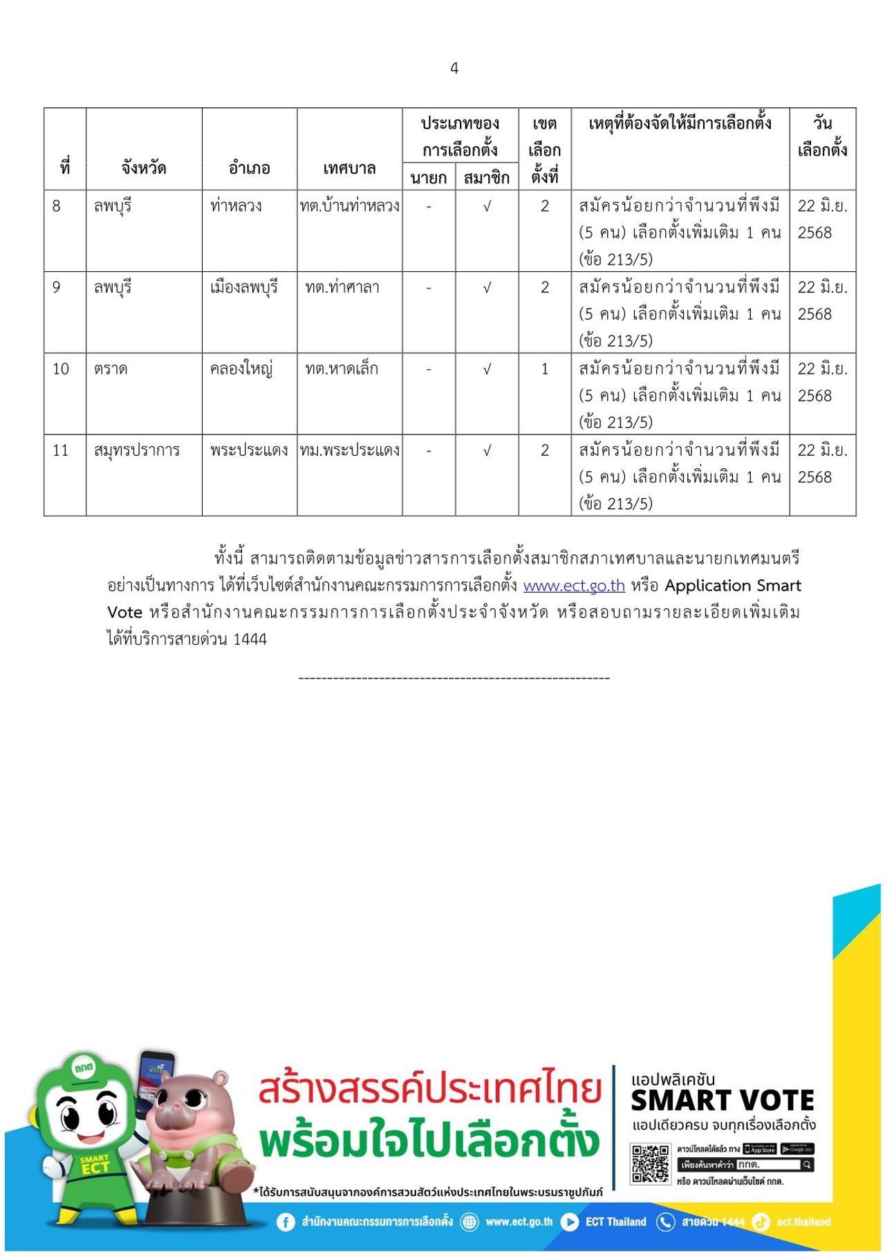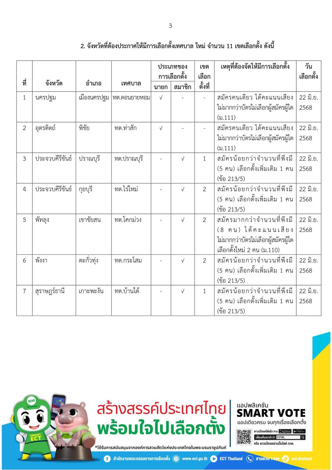 นอกจากนี้มี 11 เขตเลือกตั้งใน 9 จังหวัด ที่ต้องประกาศให้มีการเลือกตั้งเทศบาลใหม่ในวันที่ 22 มิถุนายน 2568 แบ่งเป็น