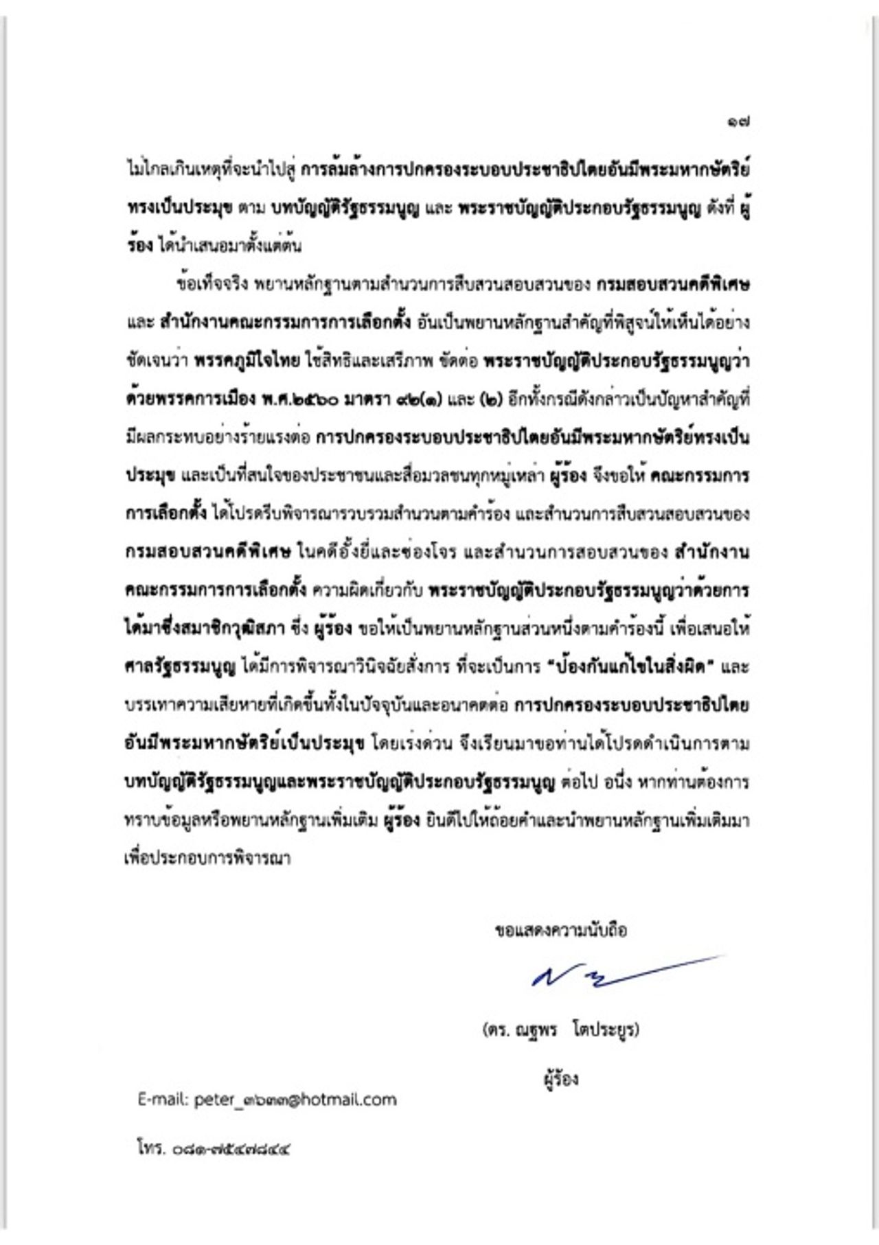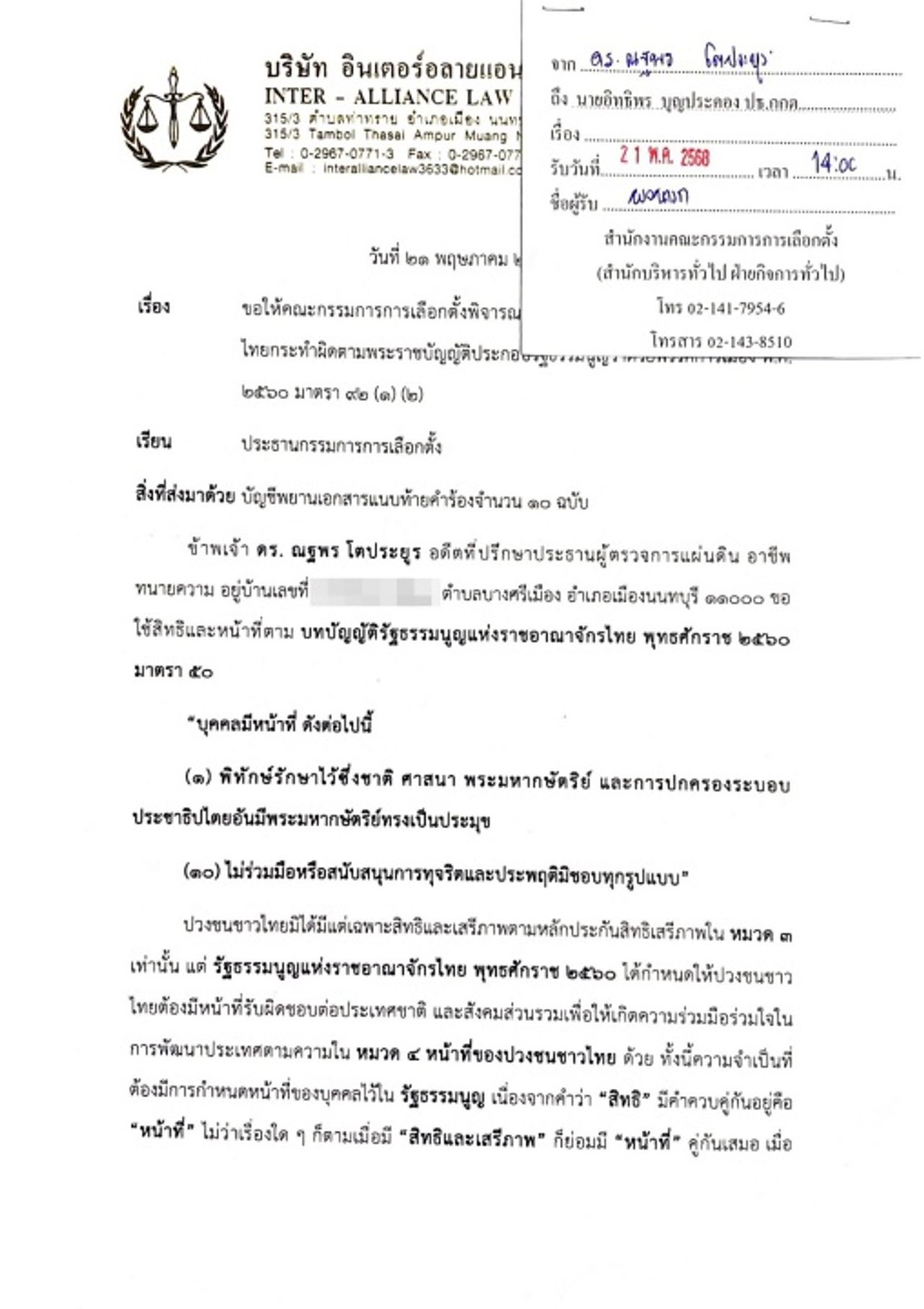 โดยมีข้อความว่า ข้าพเจ้า ดร.ณฐพร โตประยูร อดีตที่ปรึกษาประธานผู้ตรวจการแผ่นดิน อาชีพทนายความ ขอให้สิทธิและหน้าที่ตามบทบัญญัติของรัฐธรรมนูญมาตรา 50 ที่ระบุให้บุคคลมีหน้าที่