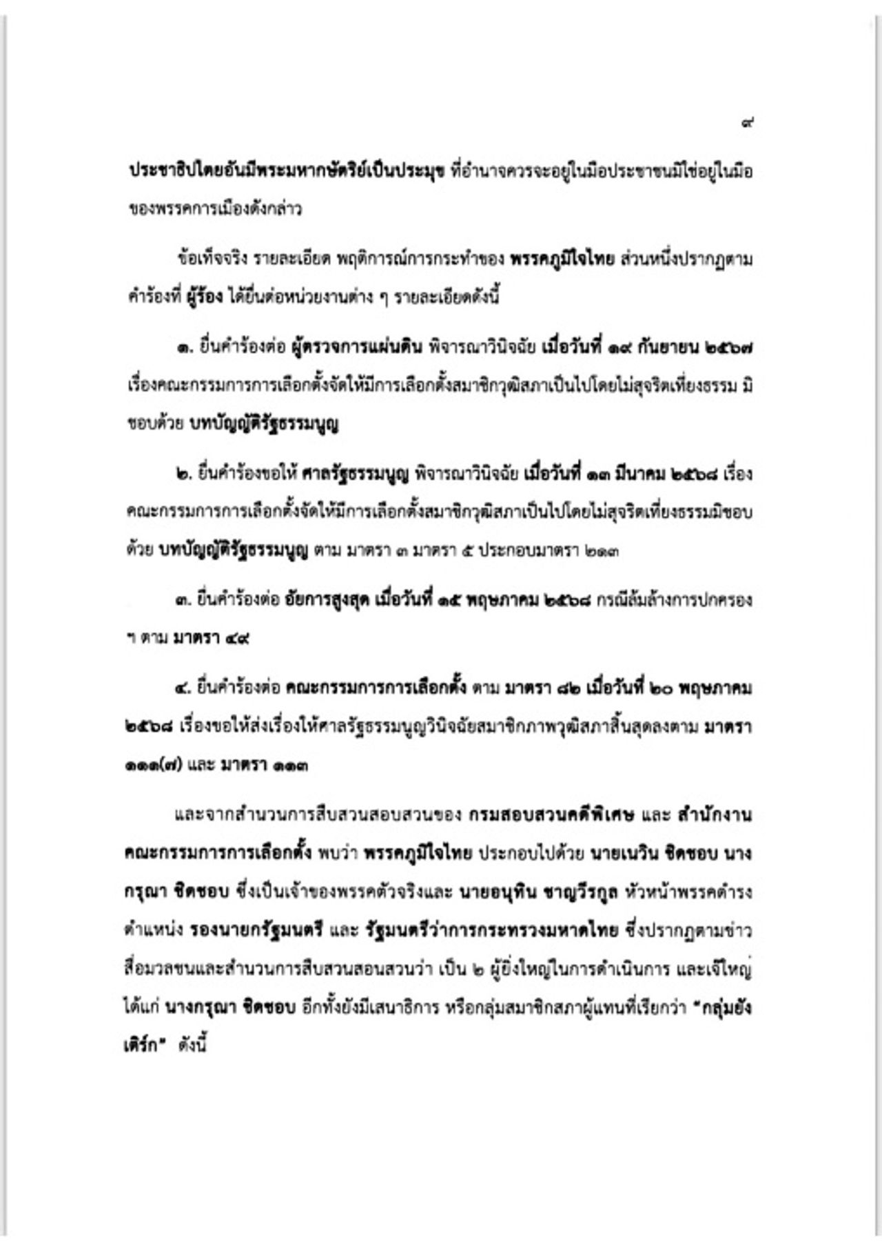 พฤติการณ์การกระทำของพรรคภูมิใจไทย ผู้บริหารพรรคภูมิใจไทย และสมาชิกวุฒิสภา พรรคภูมิใจไทยเป็นการใช้สิทธิ์หรือเสรีภาพที่ละเมิดต่อบทบัญญัติรัฐธรรมนูญที่เป็นกฎหมายสูงสุดเพื่อได้มาซึ่งอำนาจการปกครอง ที่ไม่เป็นไปตามการปกครองระบอบประชาธิปไตยอันมีพระมหากษัตริย์เป็นประมุข เมื่อคณะกรรมการมีหลักฐานอันควรเชื่อได้ว่าพรรคการเมืองใดกระทำการอย่างใดอย่างหนึ่งดังต่อไปนี้ให้ยื่นศาลรัฐธรรมนูญเพื่อสั่งยุบพรรคการเมืองนั้น