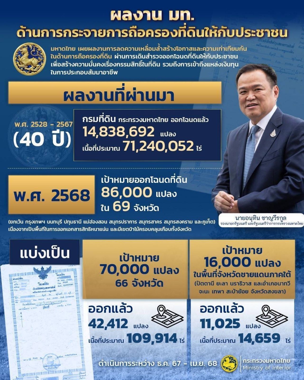 “ตั้งแต่ปี พ.ศ. 2528 - 2567 รวมระยะเวลา 40 ปี กระทรวงมหาดไทย โดยกรมที่ดิน ดำเนินการสำรวจและออกโฉนดที่ดินแล้ว 14,838,692 แปลง เนื้อที่ประมาณ 71,240,052 ไร่”