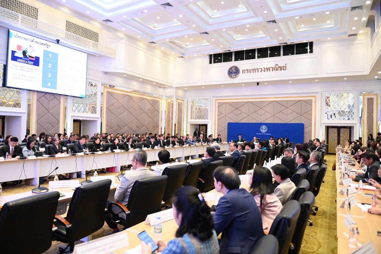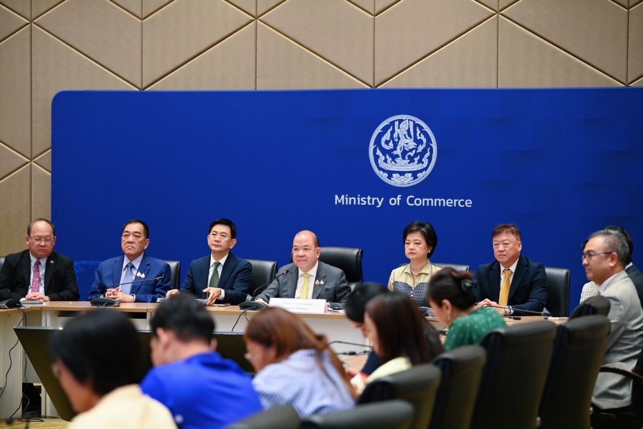 วันพุธที่ 28 พฤษภาคม 2568 ณ ห้องบุรฉัตรไชยากร ชั้น 4 สำนักงานปลัดกระทรวงพาณิชย์ นายพิชัย นริพทะพันธุ์ รัฐมนตรีว่าการกระทรวงพาณิชย์ เป็นประธานการประชุมมอบนโยบายการปฏิบัติงานแก่ผู้อำนวยการสำนักงานส่งเสริมการค้าในต่างประเทศ เอกอัครราชทูตผู้แทนถาวรไทยประจำองค์การการค้าโลกและองค์การทรัพย์สินทางปัญญาโลก อัครราชทูต (ฝ่ายการพาณิชย์) สำนักงานพาณิชย์ในต่างประเทศ (สคต.) และพาณิชย์จังหวัดทั่วประเทศ เข้าร่วมกว่า 200 ราย โดยมีนายวุฒิไกร ลีวีระพันธุ์ ปลัดกระทรวงพาณิชย์ นางสาวสุนันทา กังวาลกุลกิจ อธิบดีกรมส่งเสริมการค้าระหว่างประเทศ ดร.พจน์ อร่ามวัฒนนานนท์ ประธานกรรมการหอการค้าไทย นายเกรียงไกร เธียรนุกุล ประธานสภาอุตสาหกรรมแห่งประเทศไทย นายธนากร เกษตรสุวรรณ ประธานสภาผู้ส่งสินค้าทางเรือแห่งประเทศไทย และผู้แทนสมาคมธนาคารไทย ร่วมด้วย