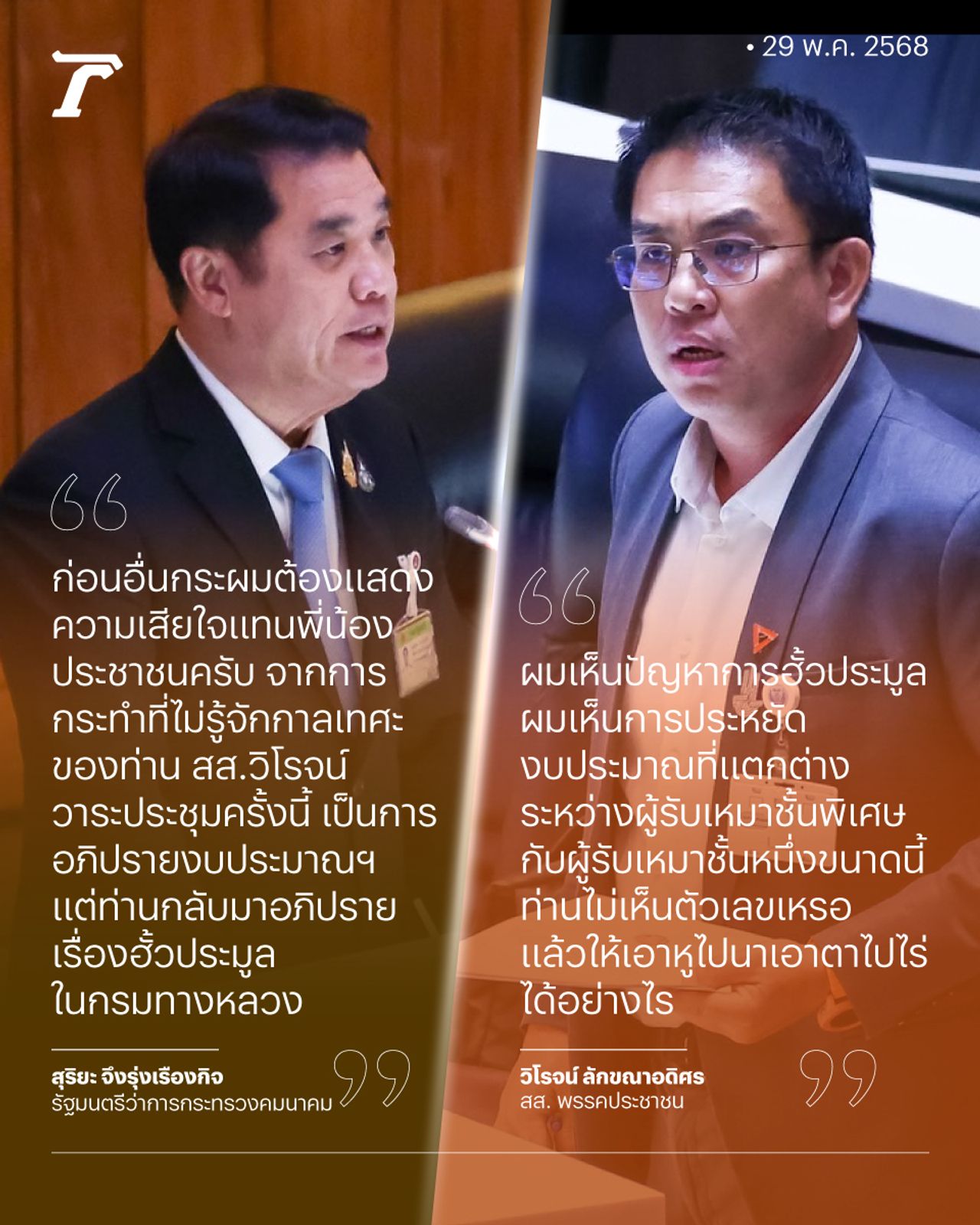 เมื่อเวลา 20.45 น. วันที่ 29 พฤษภาคม 2568 นายสุริยะ จึงรุ่งเรืองกิจ รองนายกรัฐมนตรีและรัฐมนตรีว่าการกระทรวงคมนาคม ชี้แจงในการประชุมสภาผู้แทนราษฎร สมัยวิสามัญ (เป็นพิเศษ) เรื่องด่วน ร่างพระราชบัญญัติงบประมาณรายจ่ายประจำปีงบประมาณ พ.ศ. 2569 กรณีที่ นายวิโรจน์ ลักขณาอดิศร สส.บัญชีรายชื่อ และรองหัวหน้าพรรคประชาชน อภิปรายในประเด็นการฮั้วประมูลของกรมทางหลวง และกรมทางหลวงชนบท ว่า ตนขอแสดงความเสียใจต่อประชาชน จากการกระทำที่ไม่รู้จักกาลเทศะของนายวิโรจน์ เพราะวาระคือการพิจารณางบประมาณ แต่กลับใช้โอกาสอภิปรายเรื่องการฮั้วประมูล ไม่เข้าใจว่าเหตุใดจึงไม่อภิปรายในช่วงอภิปรายไว้วางใจ