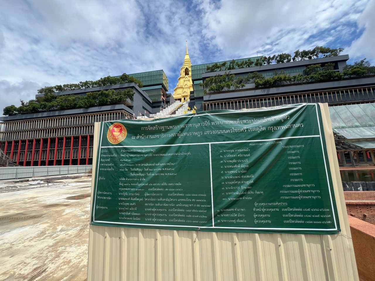 จากนั้น นายภัณฑิล และนางสาวภัสริน พาสื่อมวลชนเดินทัวร์อาคารรัฐสภา จุดแรกคือศาลาแก้ว ซึ่งนางสาวภัสริน เปิดเผยว่าหากจะมีการติดแอร์ที่ศาลาแก้ว จะต้องมีการปลูกป่าทดแทน 30 ไร่ จุดที่สองคือการจัดสร้างฐานพระบรมราชานุสาวรีย์พระบาทสมเด็จพระปกเกล้าเจ้าอยู่หัว ใช้งบประมาณ 32 ล้านบาท โดยนายภัณฑิล ยังได้ชี้ให้ดูเสาประติมากรรมหน้าจุดก่อสร้างพระบรมราชานุสาวรีย์ เหมือนอนุสรณ์สถานมีเรืออยู่ข้างล่างอิงมาจากสุโขทัยหรือไตรภูมิไหน ได้ข่าวว่าเสานี้จะถูกเลื่อยออก ทั้งที่เสียเงินทำเป็นสิบล้านบาท ถูกปล่อยทิ้งร้าง ไม่รู้ถูกส่งมอบหรือยัง ตนเองอยากได้รายละเอียดไม่ต้องมาแจงด้วยตนเองก็ได้ ขอแค่เอกสาร