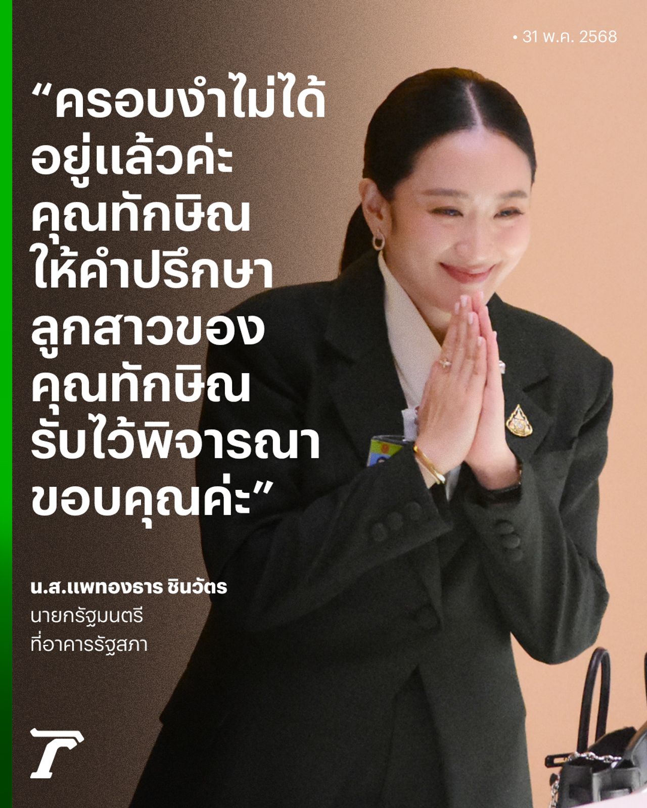 เมื่อถามว่าคำพูดของนายทักษิณ ทำให้เกิดบั่นทอนจิตใจในส่วนของพรรคร่วมรัฐบาลหรือไม่ น.ส.แพทองธาร ตอบว่าไม่นะคะ เมื่อสักครู่ก็นั่งข้างๆ กันหลายพรรคไม่มีอะไร ไม่มีใครถามถึงเรื่องนี้เลย ไม่มีใครพูดถึงเรื่องนี้เลย เมื่อถามว่าได้พูดคุยกับนายทักษิณ หรือไม่ ทำไมถึงพูดเช่นนี้ น.ส.แพทองธาร ตอบว่าคุยค่ะคุยทุกวัน ถ้าเมื่อสักครู่ถ่ายภาพตอนตนคุยโทรศัพท์ได้ก็คุยกับคุณพ่อ เมื่อถามว่าได้ถามไปหรือไม่ทำไมถึงพูดลักษณะนี้ออกมาทำให้ตอนนี้ถูกจับตาว่าครอบงำอีกแล้ว น.ส.แพทองธาร ไม่ตอบคำถามดังกล่าวเพียงแต่พูดว่า “อืม ค่ะ” ผู้สื่อข่าวถามย้ำว่าจะโดนเรื่องครอบงำอีกหรือไม่ น.ส.แพทองธาร กล่าวว่า “มันครอบงำยังไง จริงๆ แล้วคนที่รู้สึกกระทบโดยคำพูดของท่านไม่ใช่แค่ในพรรคเพื่อไทย คนไม่อยู่ในตำแหน่งการเมืองเลยก็รู้สึกกระทบกับคำพูดของท่าน อันนั้นถือว่าท่านครอบงำคนอื่นไหมคะ มันก็แล้วแต่ว่าใครรู้สึกหรือไม่ เพราะเป็นเรื่องส่วนบุคคล เราจะให้เขาครอบงำหรือไม่ เราจะรู้สึกอย่างไร ตนคิดว่ามันครอบงำไม่ได้หรอกค่ะ มันไม่ได้ แล้วแต่ว่าเราจะยอมให้เขาครอบงำหรือไม่ ไม่ใช่แค่นายทักษิณ แต่หมายถึงใครก็ได้” เมื่อถามว่ายืนยันหรือไม่นายทักษิณไม่สามารถเข้ามาครอบงำได้ น.ส.แพทองธาร ตอบว่า “คุณทักษิณ ครอบงำไม่ได้อยู่แล้วค่ะ” เมื่อถามย้ำอีกว่าอย่างไรก็จะไม่มี “ทักษิณคิด เพื่อไทยทำ 2” ใช่หรือไม่ น.ส.แพทองธาร กล่าวว่า “คุณทักษิณ ให้คำปรึกษา ลูกสาวของคุณทักษิณ รับไว้พิจารณา”