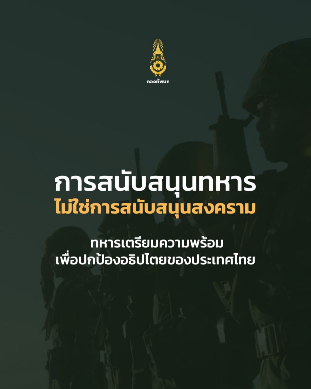 อย่างไรก็ตาม ในช่วงบ่าย เพจกองทัพบก Royal Thai Army โพสต์อีกว่า การสนับสนุนทหารไม่ใช่การสนับสนุนสงคราม ทหารเตรียมความพร้อมเพื่อปกป้องอธิปไตยของประเทศไทย