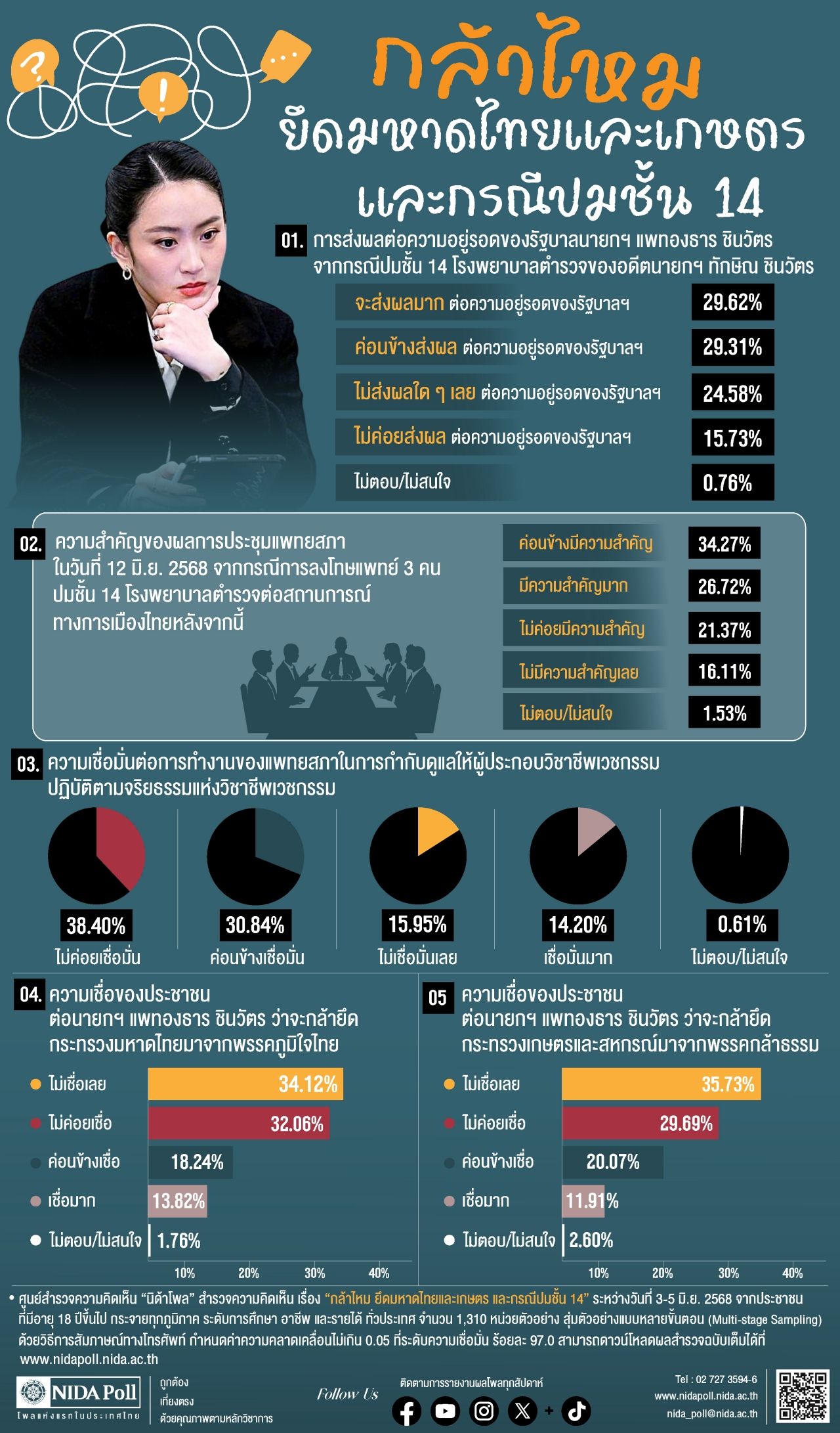 วันที่ 8 มิถุนายน 2568 ศูนย์สำรวจความคิดเห็นนิด้าโพล สถาบันบัณฑิตพัฒนบริหารศาสตร์ (นิด้า) เปิดเผยผลการสำรวจ เรื่อง “กล้าไหม ยึดมหาดไทยและเกษตร และกรณีปมชั้น 14” ทำการสำรวจระหว่างวันที่ 3-5 มิถุนายน 2568 จากประชาชนที่มีอายุ 18 ปีขึ้นไป กระจายทุกภูมิภาค ระดับการศึกษา อาชีพ และรายได้ทั่วประเทศ รวมจำนวนทั้งสิ้น 1,310 หน่วยตัวอย่าง เกี่ยวกับความเชื่อมั่นของประชาชนต่อกรณีปมชั้น 14 โรงพยาบาลตำรวจของ นายทักษิณ ชินวัตร อดีตนายกรัฐมนตรี