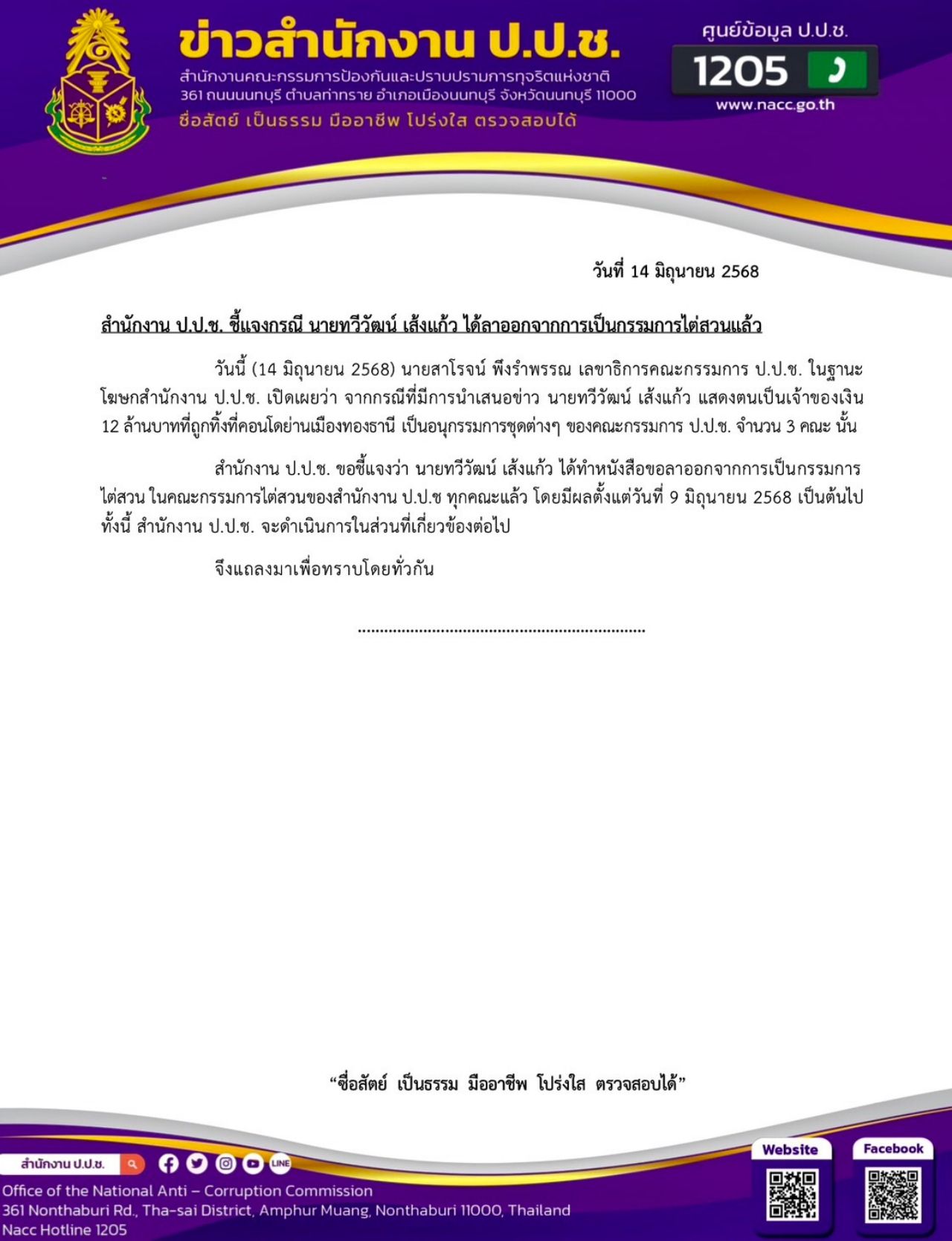วันที่ 14 มิถุนายน นายสาโรจน์ พึงรำพรรณ เลขาธิการคณะกรรมการป้องกันและปราบปรามการทุจริตแห่งชาติ (ป.ป.ช.) ในฐานะโฆษกสำนักงาน ป.ป.ช. เปิดเผยว่า จากกรณีที่มีการนำเสนอข่าว นายทวีวัฒน์ เส้งแก้ว แสดงตนเป็นเจ้าของเงิน 12 ล้านบาทที่ถูกทิ้งที่คอนโดย่านเมืองทองธานี เป็นอนุกรรมการชุดต่างๆ ของคณะกรรมการ ป.ป.ช. จำนวน 3 คณะนั้น สำนักงาน ป.ป.ช. ขอชี้แจงว่านายทวีวัฒน์ ได้ทำหนังสือขอลาออกจากการเป็นกรรมการไต่สวน ในคณะกรรมการไต่สวนของสำนักงาน ป.ป.ช. ทุกคณะแล้ว โดยมีผลตั้งแต่วันที่ 9 มิถุนายน 2568 เป็นต้นไป ทั้งนี้ สำนักงาน ป.ป.ช.จะดำเนินการในส่วนที่เกี่ยวข้องต่อไป