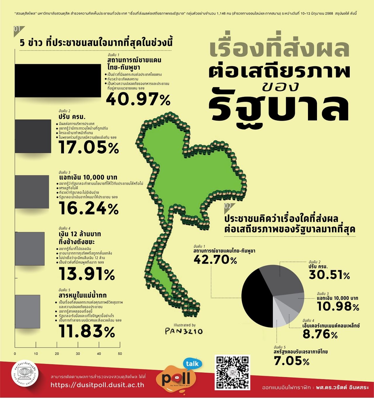 วันที่ 15 มิถุนายน 2568 สวนดุสิตโพล มหาวิทยาลัยสวนดุสิต สำรวจความคิดเห็นประชาชนทั่วประเทศ “เรื่องที่ส่งผลต่อเสถียรภาพของรัฐบาล” กลุ่มตัวอย่าง จำนวน 1,146 คน (สำรวจทางออนไลน์และภาคสนาม) ระหว่างวันที่ 10-13 มิถุนายน 2568 พบว่า 5 ข่าวที่คนสนใจมากที่สุดในช่วงนี้ คือ