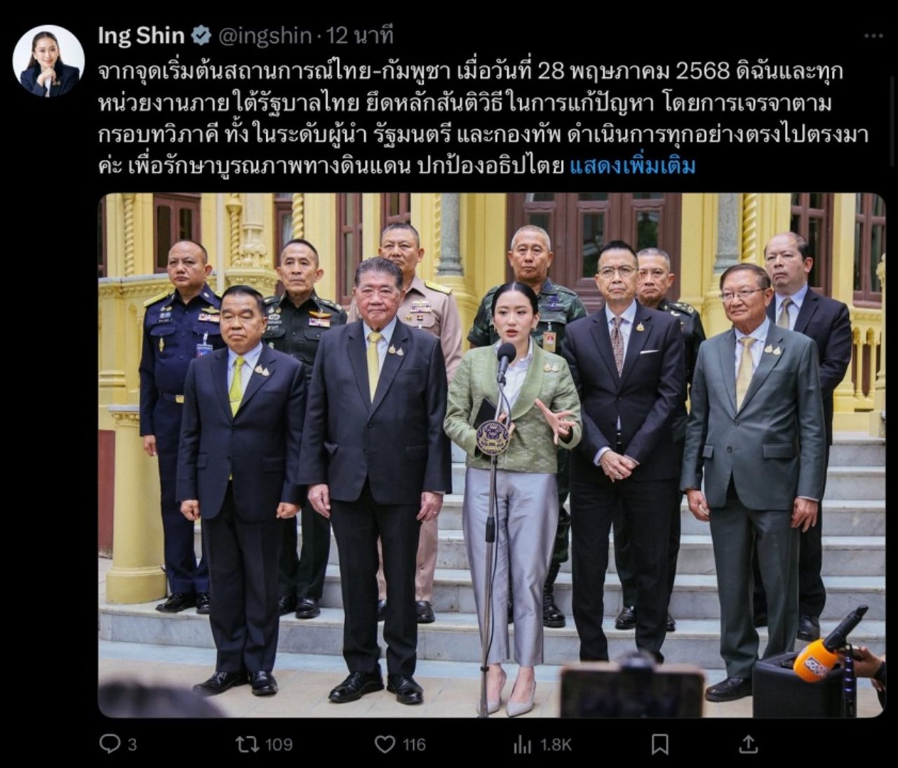 เมื่อเวลา 15.55 น. วันที่ 16 มิ.ย. 2568 น.ส. แพทองธาร ชินวัตร นายกรัฐมนตรีได้โพสต์ข้อความผ่านเฟซบุ๊กถึงสถานการณ์ชายแดนไทย-กัมพูชา มีเนื้อหาสรุปว่า จากจุดเริ่มต้นสถานการณ์ไทย-กัมพูชา เมื่อวันที่ 28 มิ.ย. 2568 ตนและทุกหน่วยงานยึดหลักสันติวิธีในการแก้ปัญหา โดยการเจรจาตามกรอบทวิภาคี ดำเนินการทุกอย่างตรงไปตรงมาเพื่อรักษาบูรณภาพทางดินแดน ปกป้องอธิปไตย สร้างสันติภาพตามแนวชายแดน การเจรจาของรัฐบาลไทยเป็นไปตามแนวทางปฏิบัติสากลผ่านช่องทางการสื่อสารทางการของรัฐ งดเว้นการสื่อสารรายวัน ไม่ยั่วยุหรือท้าทาย เพื่อให้เกียรติประเทศคู่เจรจา ขอย้ำรัฐบาลไทยไม่เคยออกคำสั่งปิดด่านชายแดน สิ่งที่ดำเนินการอยู่คือการกำหนดเวลาเปิด-ปิดด่าน จากมติในที่ประชุม สมช. เพื่อป้องกันผลกระทบจากการเคลื่อนไหวของกำลังทหารและอาวุธที่ใช้ปฏิบัติการในระยะไกลของฝ่ายกัมพูชา ที่ผ่านมาการประชุม JBC ผ่านไปด้วยดี แม้มีข้อเห็นต่างกัน แต่เพื่อรักษาแนวทางการเจรจา รัฐบาลไทยจึงเสนอให้มีการประชุมในกรอบ RBC ซึ่งเป็นระดับผู้นำกองทัพ โดยมีวัตถุประสงค์เพื่อลดความตึงเครียด ให้ทั้งสองฝ่ายมีการปรับกำลังในพื้นที่เผชิญหน้าให้กลับมาเหมือนปี พ.ศ. 2567