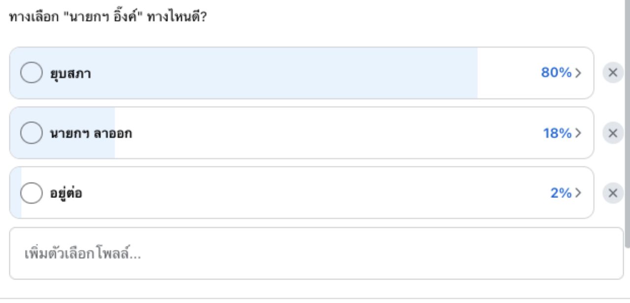 ผลสำรวจพบว่า ผู้ร่วมโหวตกว่า 80% (44,256 เสียง) มองว่าควรยุบสภา เพื่อเปิดทางสู่การเลือกตั้งใหม่ ขณะที่ 18% (9,725 เสียง) มองว่าให้ น.ส.แพทองธาร ลาออก เปิดทางให้สภาผู้แทนราษฎรเลือกนายกฯ คนใหม่ และมี 2% (1,530 เสียง) เท่านั้นที่เห็นควรว่าให้ น.ส.แพทองธาร อยู่ต่อ.