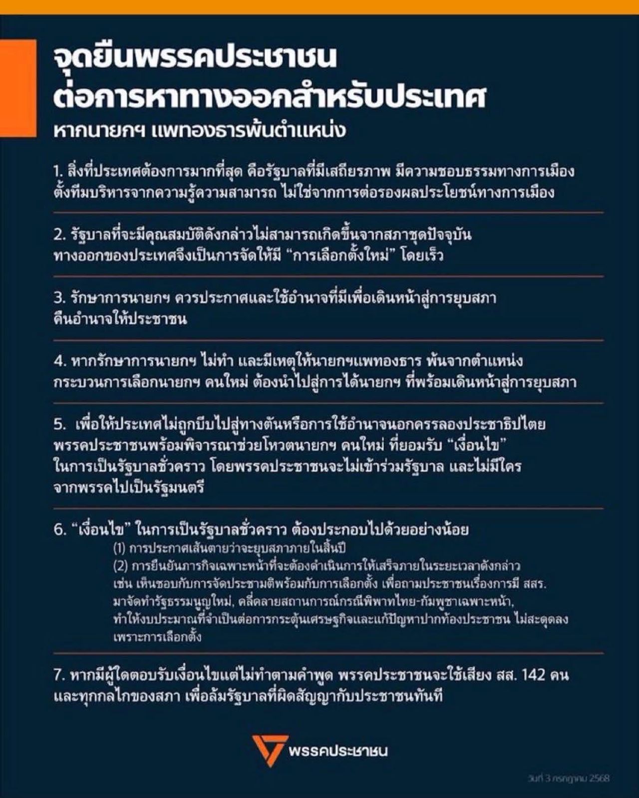 วันที่ 3 ก.ค. 2568 ผู้สื่อข่าวรายงานว่าเฟซบุ๊กของพรรคประชาชน ประกาศจุดยืนต่อการหาทางออกสำหรับประเทศ หากนายกฯ แพทองธารพ้นตำแหน่ง โดยระบุว่า