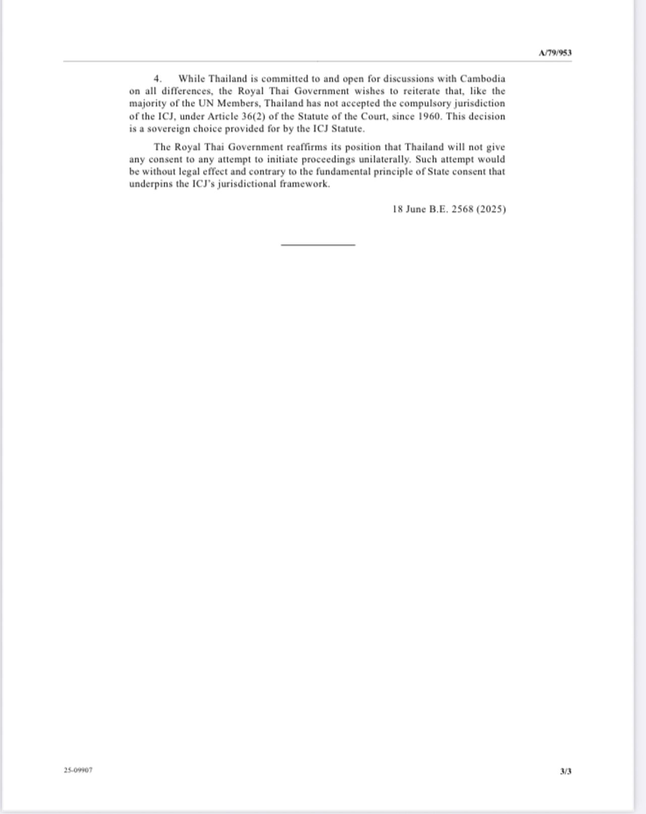 2. เมื่อ 19 มิ.ย. 68 เอกอัครราชทูตผู้แทนถาวรไทย ณ นครนิวยอร์ก ได้มีหนังสือถึง UNSG นำส่งแถลงการณ์ Statement by the Royal Thai Government on Thailand - Cambodia border situation ลงวันที่ 18 มิ.ย. 68 ชี้แจงข้อเท็จจริง รวมทั้งท่าทีและการดำเนินการของฝ่ายไทยเกี่ยวกับเรื่องนี้ ซึ่งเป็นไปตามหลักกฎหมายระหว่างประเทศ ความตกลง MOU2543 (MOU2000) และแนวทางการแก้ไขปัญหาด้วยการเจรจาทวิภาคีตามที่ทั้งสองฝ่ายได้ตกลงกันไว้และมีพันธกรณี พร้อมขอให้เวียนทั้งหนังสือลงนามและแถลงการณ์ดังกล่าวเป็นเอกสารของสมัชชาสหประชาชาติ ภายใต้ระเบียบวาระที่ 32 ด้วยเช่นกัน