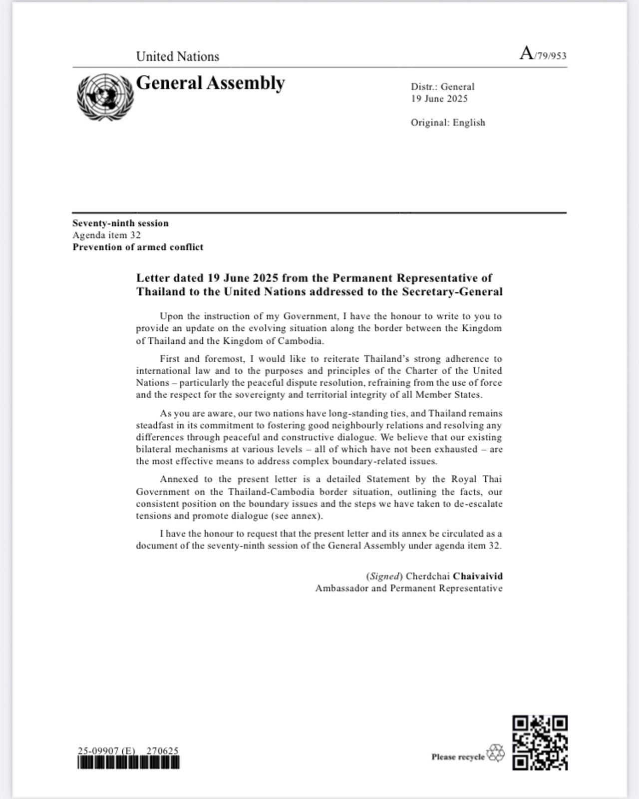 1. เมื่อ 16 มิ.ย. 68 เอกอัครราชทูตผู้แทนถาวรกัมพูชา ณ นครนิวยอร์ก ได้มีหนังสือถึงเลขาธิการสหประชาชาติ (UNSG) เกี่ยวกับสถานการณ์ความตึงเครียดตามแนวทางชายแดนไทย-กัมพูชา โดยขอให้เวียนหนังสือเป็นเอกสารของสมัชชาสหประชาชาติ ภายใต้ระเบียบวาระที่ 32 ของการประชุมสมัชชาสหประชาชาติ สมัยที่ 79 เรื่อง Prevention of armed conflict