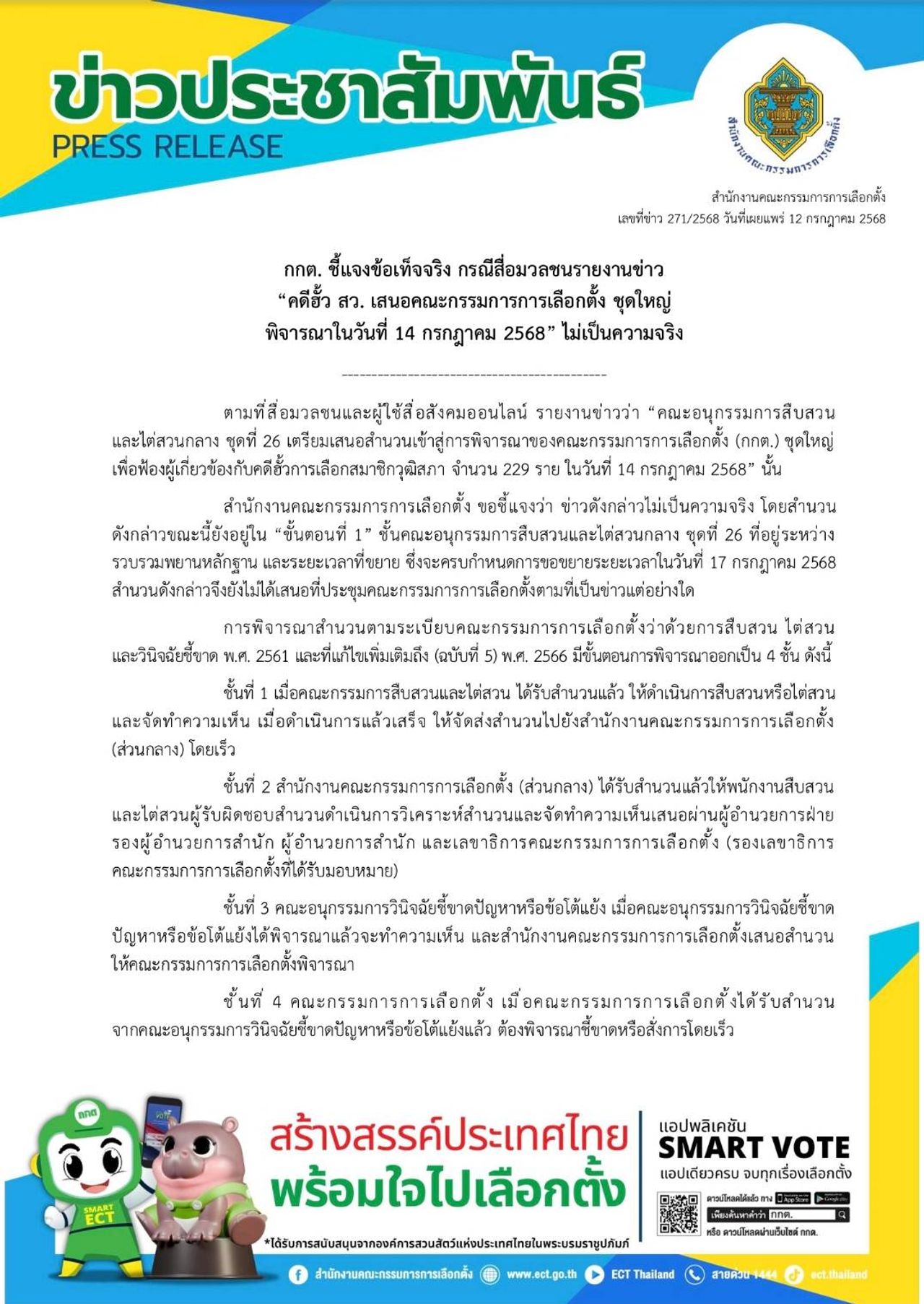 ต่อมาเมื่อเวลา 20.44 น. สำนักงาน กกต. ได้ออกเอกสารข่าวโดยมีใจความว่า ตามที่สื่อมวลชนและผู้ใช้สื่อสังคมออนไลน์รายงานข่าวว่า คณะอนุกรรมการสืบสวนและไต่สวนกลาง ชุดที่ 26 เตรียมเสนอสำนวนเข้าสู่การพิจารณาของ กกต. ชุดใหญ่ เพื่อฟ้องผู้เกี่ยวข้องกับคดีฮั้วการเลือก สว. จำนวน 229 ราย ในวันที่ 14 ก.ค. นั้น สำนักงาน กกต. ขอชี้แจงว่า ข่าวดังกล่าวไม่เป็นความจริง โดยสำนวนดังกล่าวขณะนี้ยังอยู่ใน “ขั้นตอนที่ 1” ชั้นคณะอนุกรรมการสืบสวนและไต่สวนกลาง ชุดที่ 26 ที่อยู่ระหว่างรวบรวมพยานหลักฐาน และระยะเวลาที่ขยาย ซึ่งจะครบกำหนดการขอขยายระยะเวลาในวันที่ 17 ก.ค. 2568 สำนวนดังกล่าวจึงยังไม่ได้เสนอที่ประชุม กกต. ตามที่เป็นข่าวแต่อย่างใด การพิจารณาสำนวนตามระเบียบ กกต. ว่าด้วยการสืบสวน ไต่สวนและวินิจฉัยชี้ขาด พ.ศ. 2561 และที่แก้ไขเพิ่มเติมถึง (ฉบับที่ 5) พ.ศ. 2566 มีขั้นตอนการพิจารณาออกเป็น 4 ชั้น ดังนี้ 1. เมื่อคณะกรรมการสืบสวนและไต่สวนได้รับสำนวนแล้ว ให้ดำเนินการสืบสวนหรือไต่สวนและจัดทำความเห็น เมื่อดำเนินการแล้วเสร็จ ให้จัดส่งสำนวนไปยังสำนักงาน กกต. (ส่วนกลาง) โดยเร็ว 2. สำนักงาน กกต. (ส่วนกลาง) ได้รับสำนวนแล้วให้พนักงานสืบสวนและไต่สวนผู้รับผิดชอบสำนวนดำเนินการวิเคราะห์สำนวน และจัดทำความเห็นเสนอผ่านผู้อำนวยการฝ่าย รองผู้อำนวยการสำนัก ผู้อำนวยการสำนัก และเลขาธิการ กกต. (รองเลขาธิการ กกต. ที่ได้รับมอบหมาย)